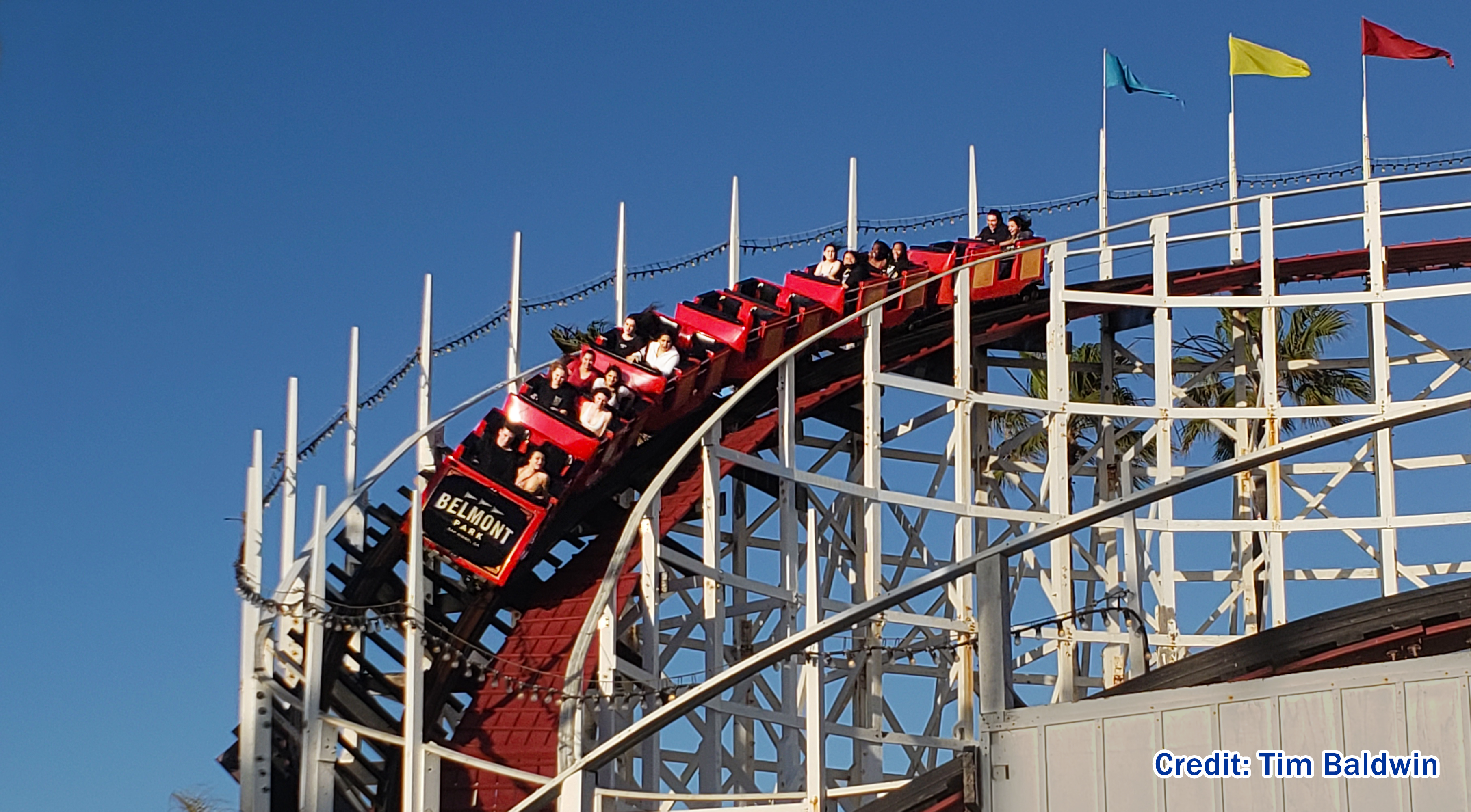 Amusement parks can be kitschy, indulgent, and a little cheesy—and at Belmont Park, we embrace it. The ocean-adjacent San Diego mini amusement park is hard to miss as you drive west on Mission Bay Drive, thanks to the towering Giant Dipper roller coaster that serves as the park's centerpiece.