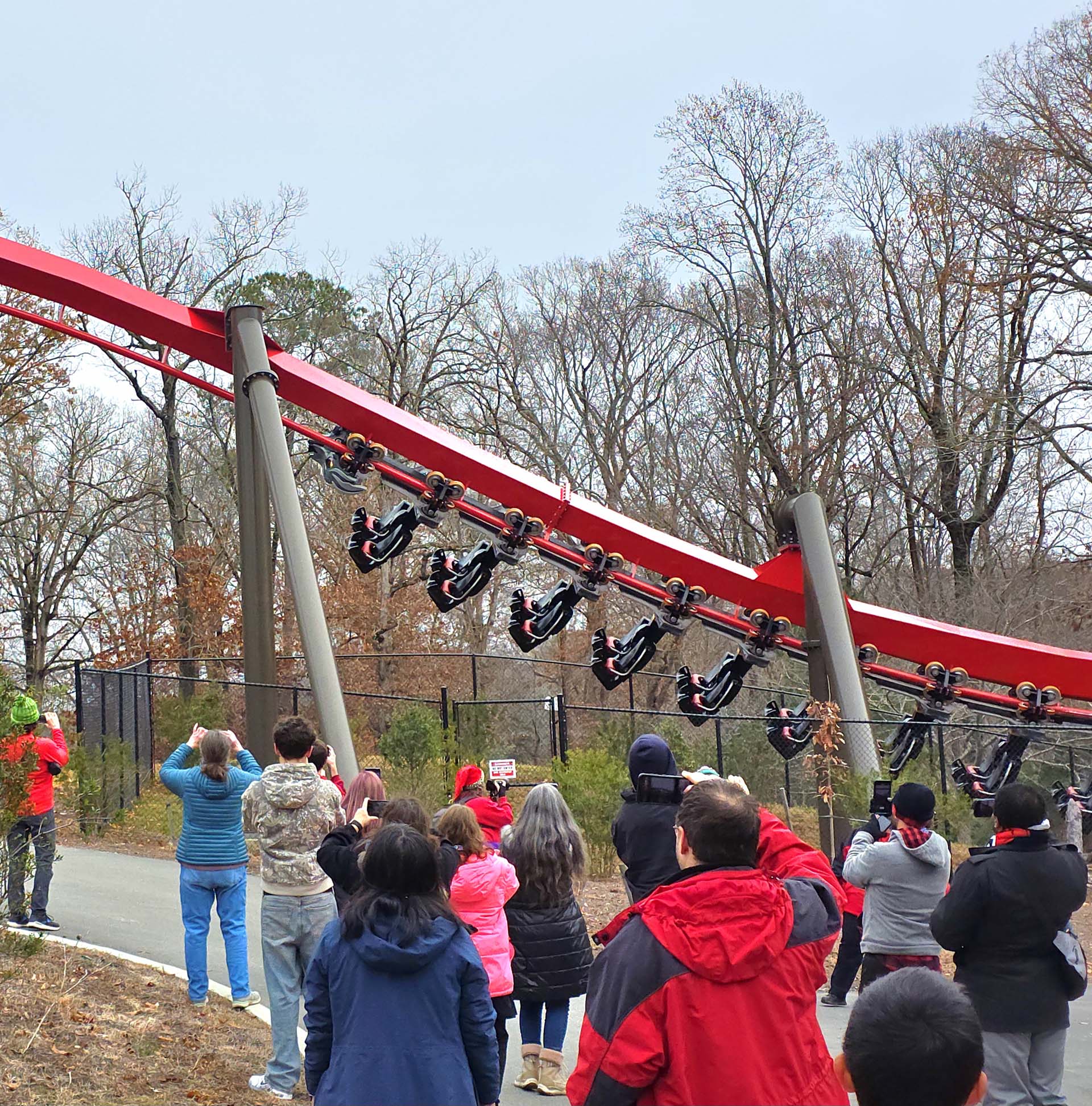 Park officials guided the group through the park’s backstage areas and even into the ride-restricted area of the coaster! Along the way, attendees heard trivia and anecdotes about the ride’s creation and history. A group photo was taken inside the ride area with the bold red Bolliger & Mabillard track occupying most of the foreground — certainly a unique photo opportunity.