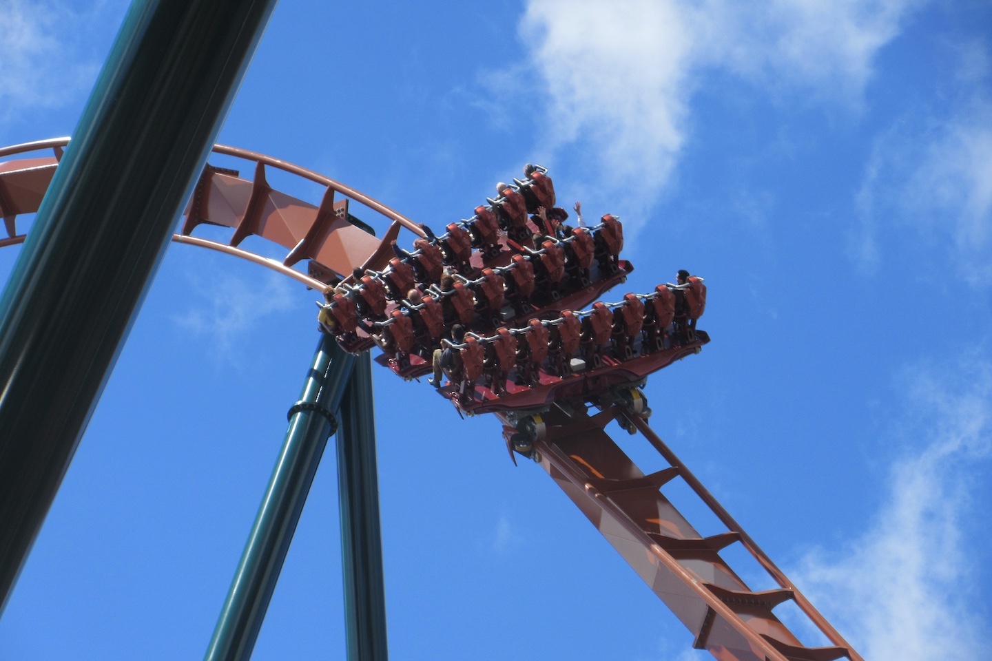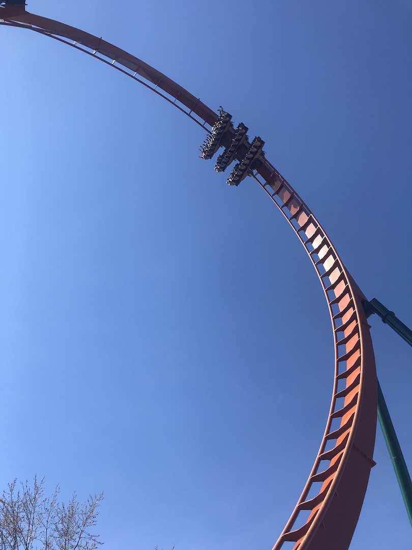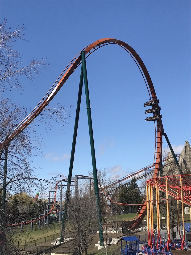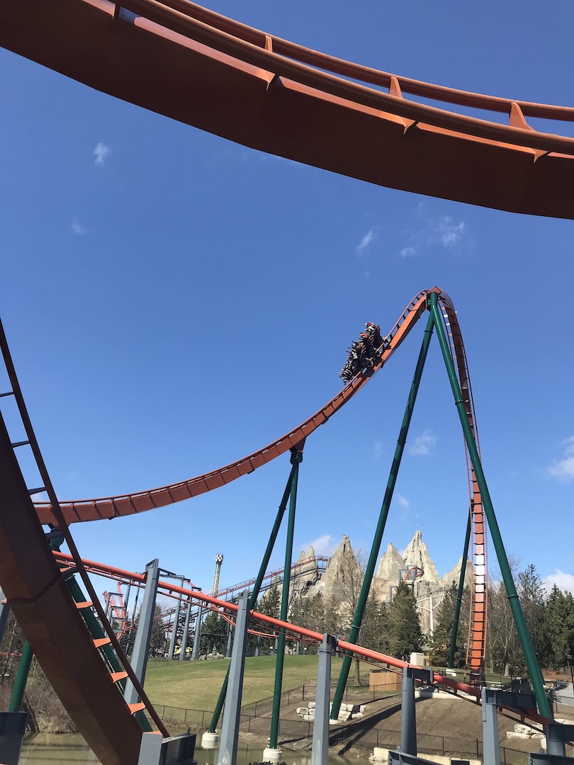 Each B&M coaster at Canada’s Wonderland (Yukon Striker, Behemoth and Leviathan) faces a different direction, offering contrasting views of the park and surrounding area. Sitting on much of the land once occupied by the rare (to North America) TOGO stand-up coaster, Skyrider (closed in 2014 and sold, now operating as Freestyle at Cavalino Matto in Italy), it sets a new standard for B&M dive coasters.