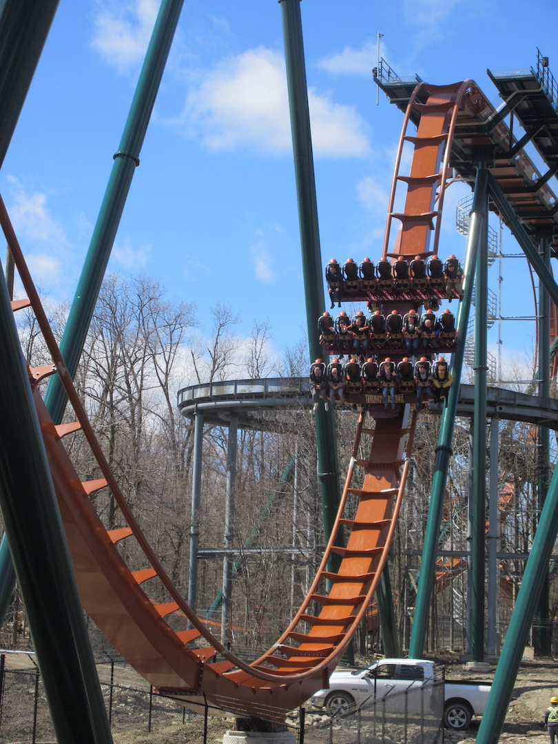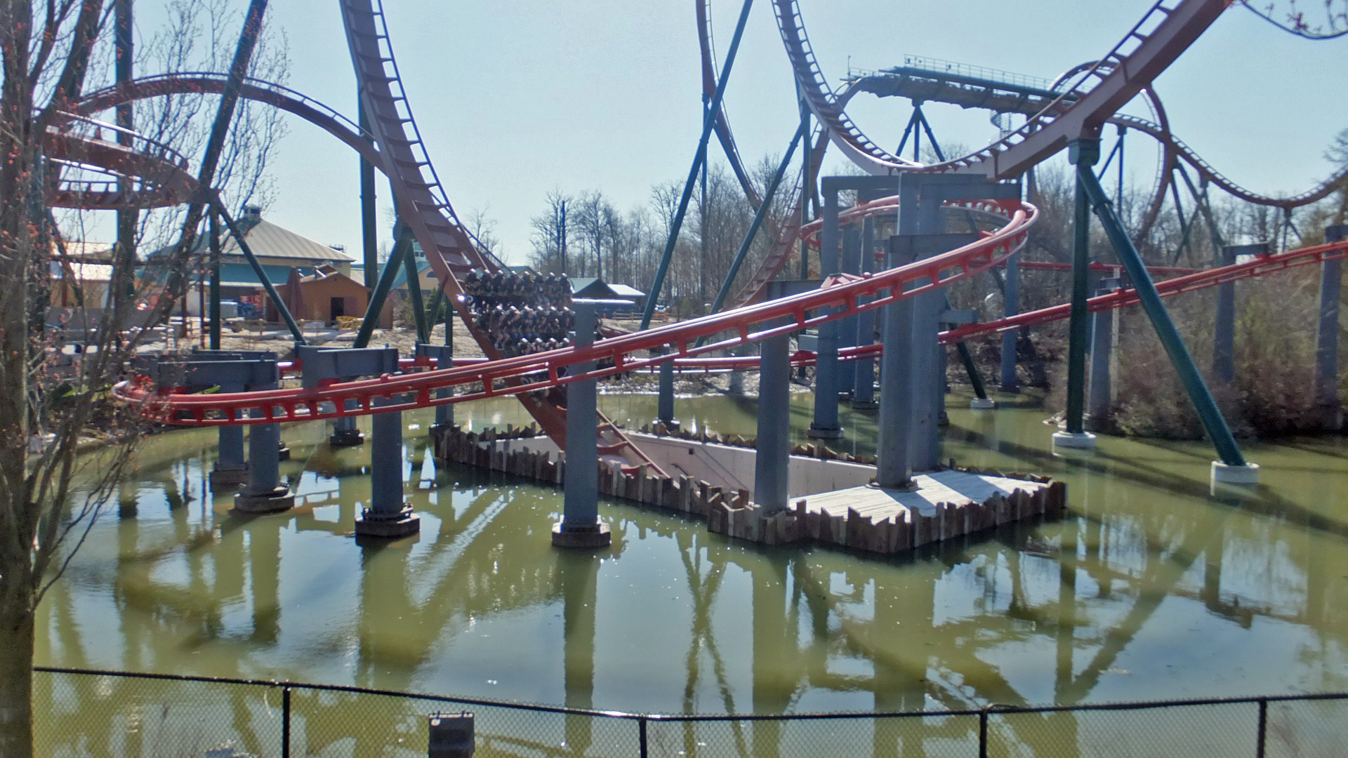 Yukon Striker boasts a custom layout. Hanging over the edge of the drop for what seems like an eternity (but is only three seconds), riders look down and see a tunnel — a tunnel that looks far too small for the train to fit through. The 90-degree drop plunges riders through the middle of the helix of Vortex (1991 Arrow suspended coaster) at 80 mph, through the underwater tunnel and up into an Immelmann before entering a zero-G roll. Riders bank into a right-hand turn into the first-of-its-kind (on a dive coaster, anyway) element, the 360-degree loop. Exiting the loop, riders are already into the forest near White Water Canyon as they enter into another Immelmann and start heading back for the station. The trains enter a small brake run and into the helix before the ride ends after just over three minutes. Yukon Striker interacts with two different rides in the park, Vortex and Timberwolf Falls shoot-the-chute. Once the trees fill in for the season, the back half of this ride will be lost from sight, adding to the excitement.