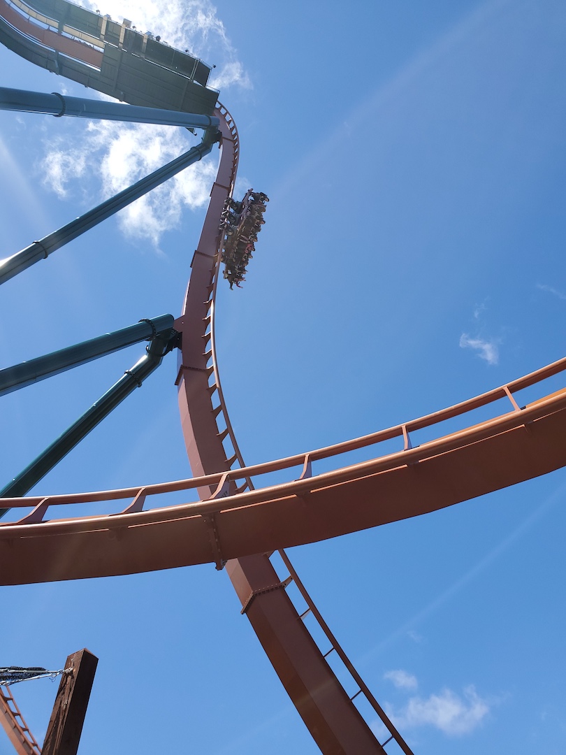 Yukon Striker features four inversions, an underwater tunnel and fantastic theming. Each train holds 24 passengers (eight across, three rows). Have loose articles? Not a problem, but there are no regular bins on this ride. Noooo. Instead, an overhead track system moves the bins from the loading side up and over the track to the exit. The trains all have different colors, red with bronze, silver or gold (one sort of resembling Iron Man).