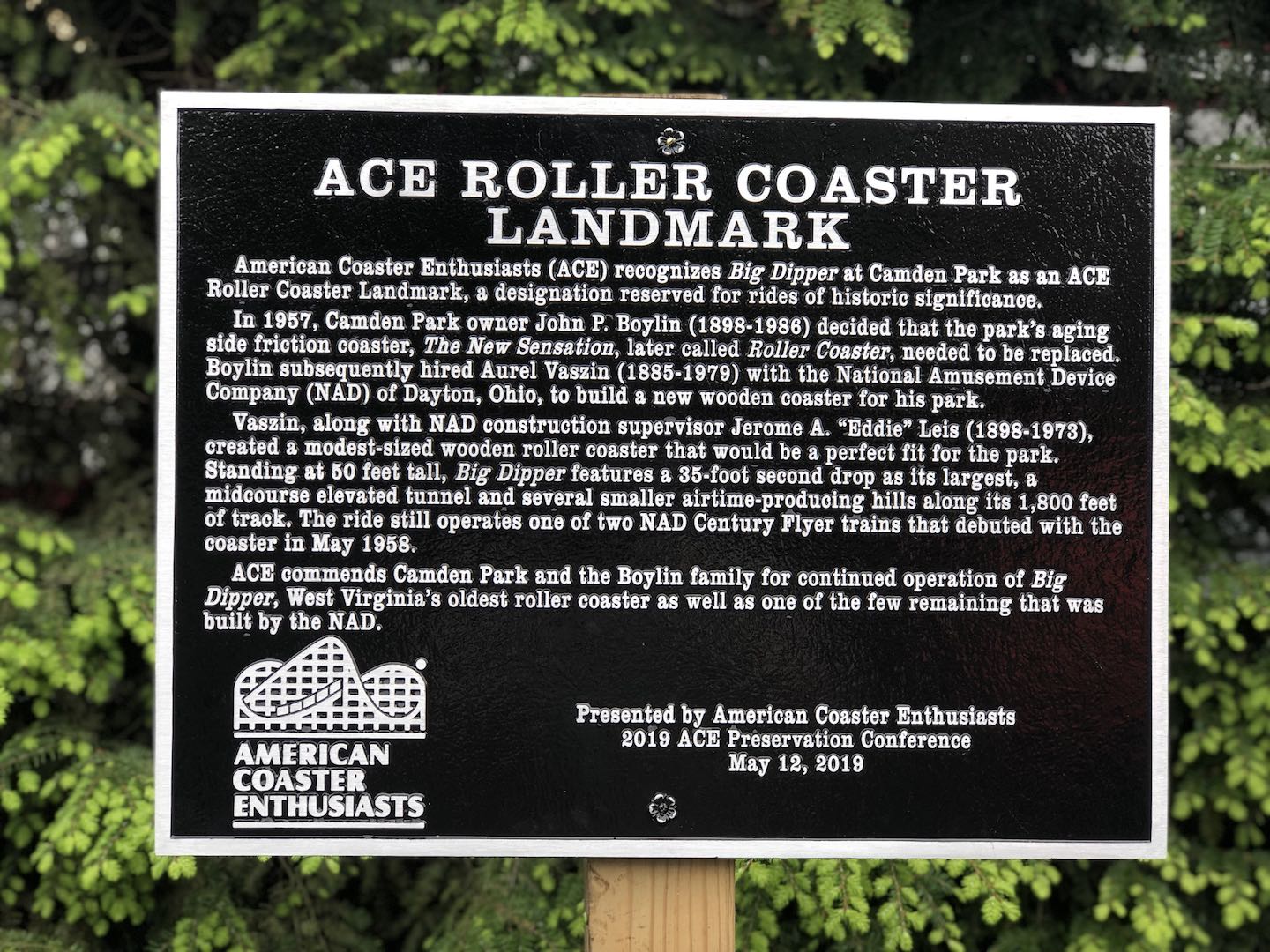 On Sunday, May 12, the 2019 ACE Preservation Conference concluded on a high note. The successful event found first-time visitors to Camden Park (Huntington, West Virginia) discovering the old-school thrills of Big Dipper — or returning members rediscovering all the classic nuances of this venerable machine. An afternoon ceremony captured the support and enthusiasm for Big Dipper as it was officially designated an ACE Roller Coaster Landmark.