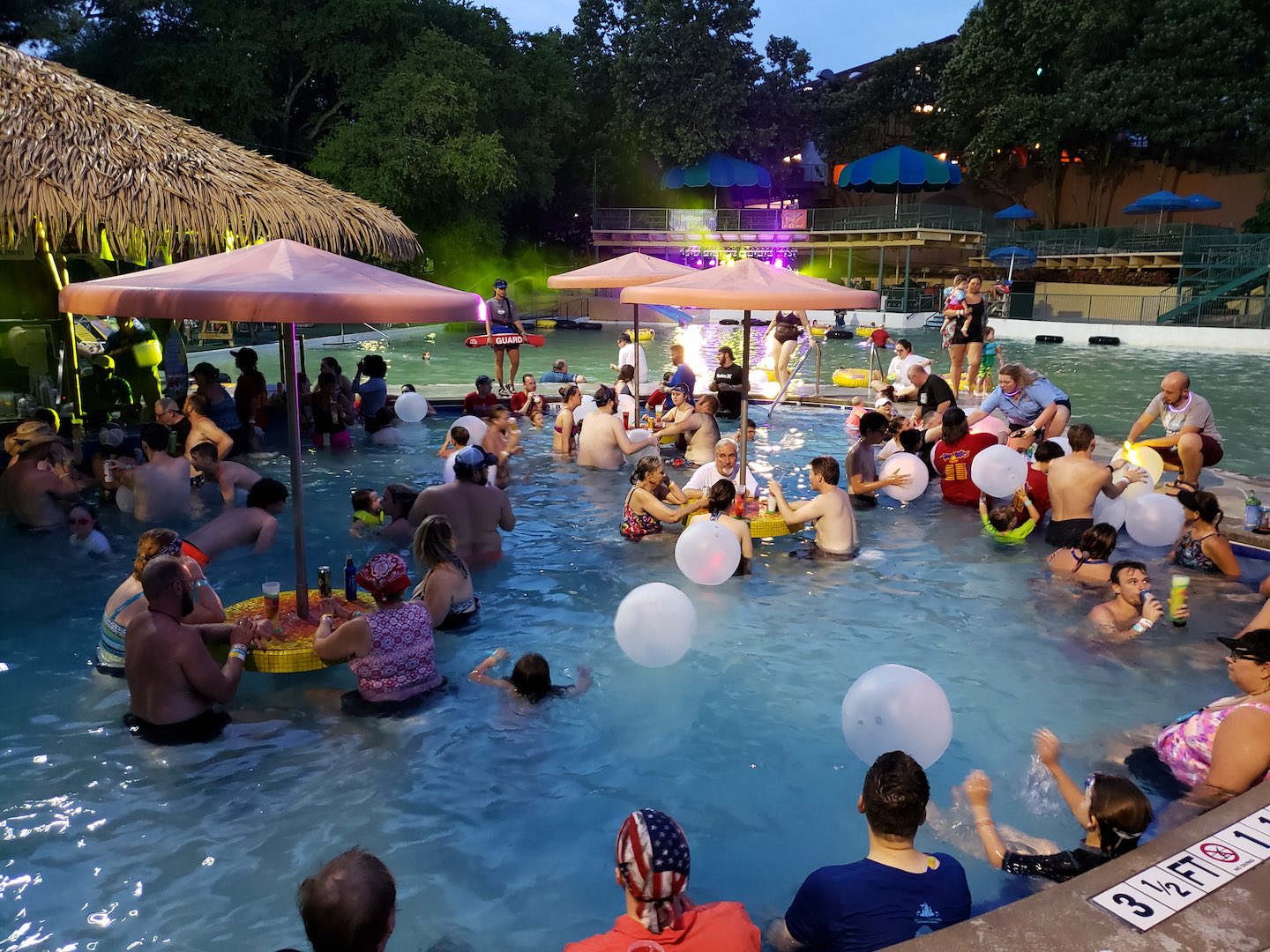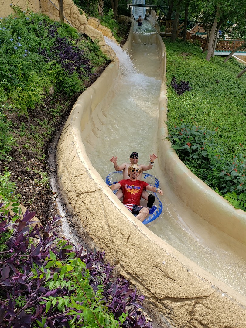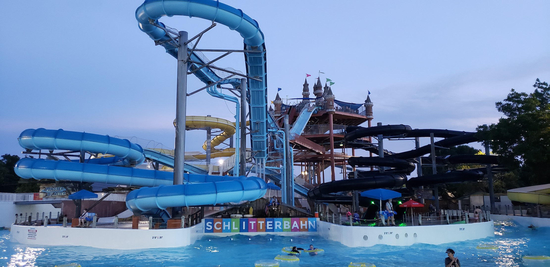 As the park closed to the public, Schlittercon attendees were treated to an hour of exclusive time on many of Blastenhoff area’s attractions, such as the Torrent River, Black Knight slides, Wolfpack, and, of course, Master Blaster. Then it was time to move to the Surfenburg section to close out the first day’s activities. Many guests participated in the annual ACE South Central Boogie Bahn competition. Nearby, others spent time relaxing in the park’s giant heated pool while enjoying an adult (or non-alcoholic) beverage of their choice. A taco/nacho bar offered a late-night snack as the New Braunfels High School steel drum band provided the evening’s musical entertainment.