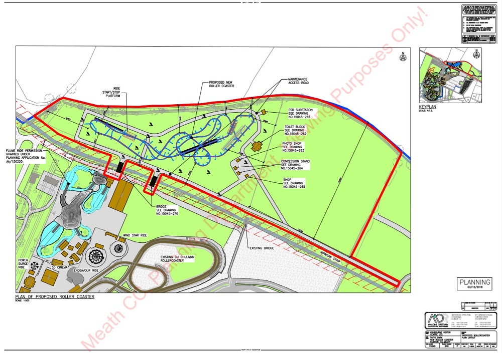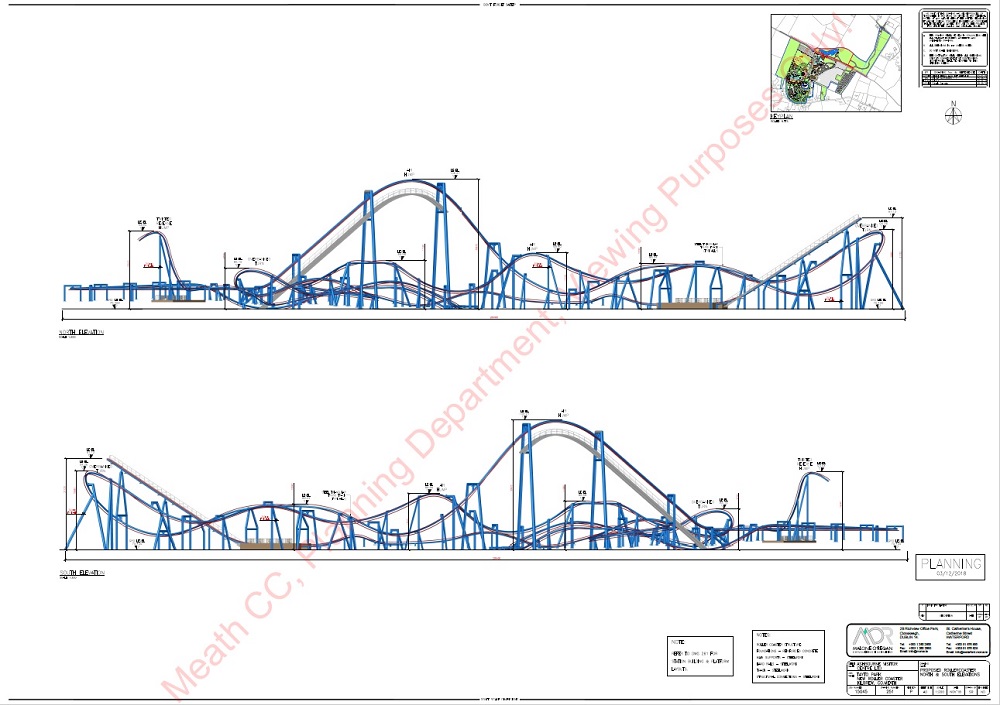 A previous ACE News story (February 2019) noted that Tayto Park (Ashbourne, Meath, Ireland) announced it will build an “iconic” steel coaster. The article noted it would be a step-by-step process — that is, the park said it would proclaim its intentions in 2018, secure planning in 2019, build the coaster in 2020 and open the 14 million Euro ride in 2021. The step-two 2019 promised action has already occurred — the park has secured planning permission from the local Meath County Council. The recorded details indicate that the coaster (which Tayto Park’s owner intriguingly teased will be “two roller coasters in one”) will be by Vekoma, but some inquisitive minds wanted to know more. Plans submitted by the park and obtained by such groups as ThemeParks-EU, Screamscape and Coaster-Nation revealed that the proposed ride will combine and interweave both an inverted coaster and a sit-down, more family-friendly, shuttle coaster. The inverted (the tallest of the two) will be 105 feet tall. Track length will be 2,388 feet for the larger ride and 801 for the shuttle.