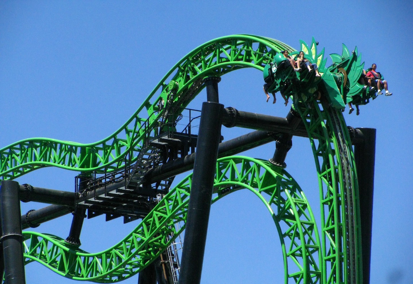 Six Flags Magic Mountain (Valencia, California) has announced that it will be removing the steel Green Lantern: First Flight coaster to make room for future development. The 105-foot-tall attraction has been classified standing-but-not-operating since July 2017. Manufactured by Intamin, Green Lantern was the first and only ZacSpin model in the United States. The three others in the world, still in operation, are 2007’s Inferno at Terra Mitica park (Benidorm, Spain), Kirnu at Linnanmäki (Helsinki, Finland) and 2009’s Insane at Gröna Lund (Stockholm, Sweden). On a side note, it was with the debut of Green Lantern in 2007 that Six Flags Magic Mountain claimed the title of the most roller coasters in the world (a superlative previously boasted by Cedar Point).