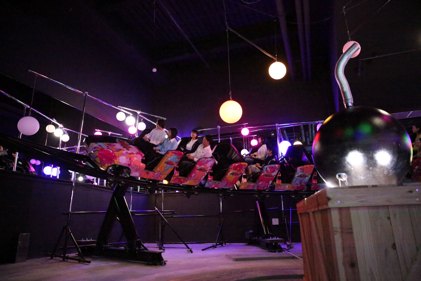 The ride experience employs lighting effects, projections, lamps and special effects along the way to create the impression of cartoonish “comical” explosions going off all around (“Daaan” sort of translates onomatopoetically to a bomb’s “boom” sound).