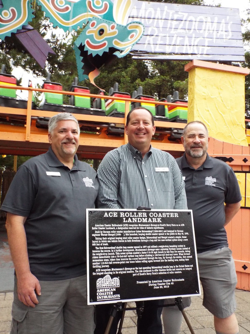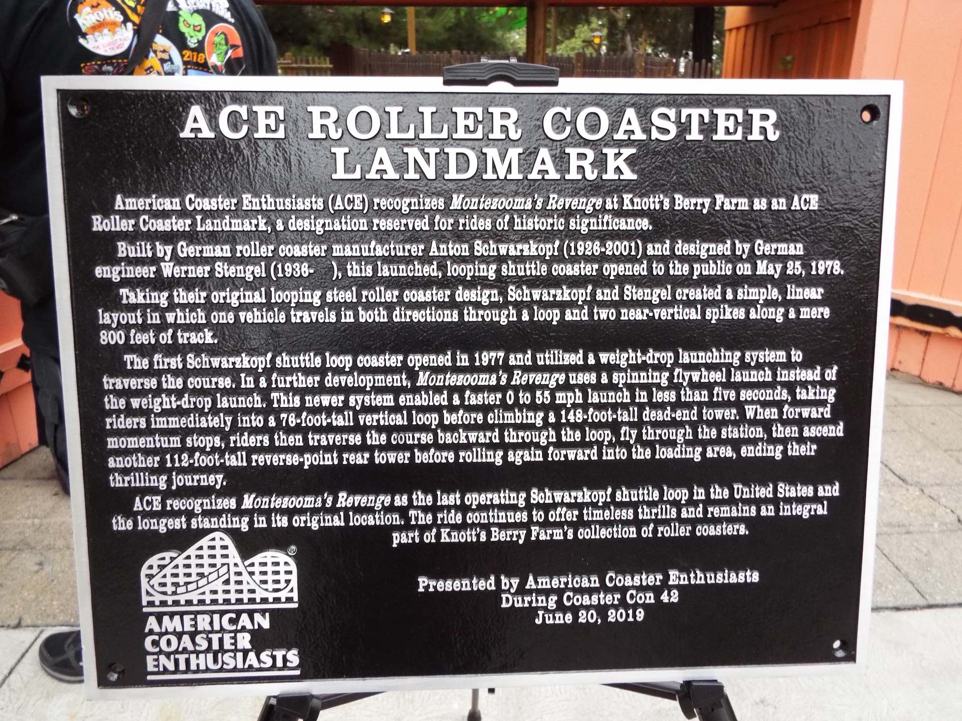 Today, Montezooma’s Revenge is the park’s oldest standing coaster. It continues to thrill riders of yet another generation and, it is hoped, will thrill several more generations to come. During Coaster Con 42, co-hosted by Knott’s Berry Farm, American Coaster Enthusiasts designated Montezooma’s Revenge as an ACE Roller Coaster Landmark.