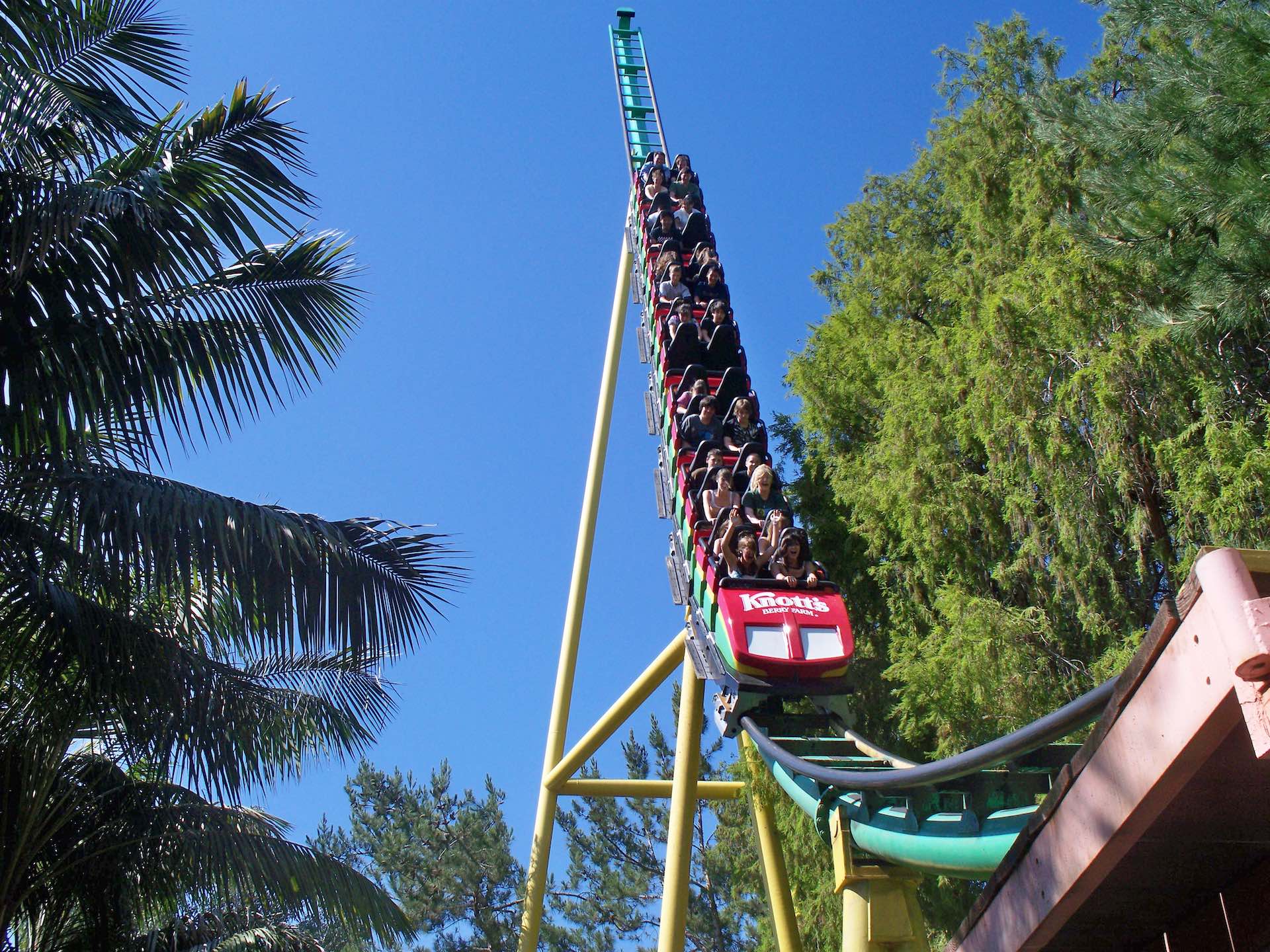 Knott’s Berry Farm in Buena Park, California, is perhaps one of the more unusual theme parks to come into being. Located on what was an actual berry farm owned by Walter and Cordelia Knott, the park had its humble beginning as a berry stand on the property where the Knott family sold their berries, jams, jellies and pies. Walter Knott specialized in successfully cultivating and growing the boysenberry, a cross between blackberries, loganberries and raspberries, which became a new sensation for his farm. Walter’s wife, Cordelia, began to sell fried chicken dinners in 1934 at the farm, which became a very successful form of income for the Knott family during the Great Depression. As lines grew for the successful restaurant, Walter decided to bring in actual abandoned buildings from ghost towns in the region to entertain guests while waiting to be seated. Soon Walter Knott’s “ghost town” became an attraction unto itself, drawing tourists from all over. When nearby Disneyland opened on July 17, 1955, visitors to Knott’s Ghost Town began to soar. Although Walter Knott had already added an authentic steam train in 1951 to the Ghost Town, he began to add other rides to the park. Soon Knott’s Berry Farm became a destination theme park unto itself.