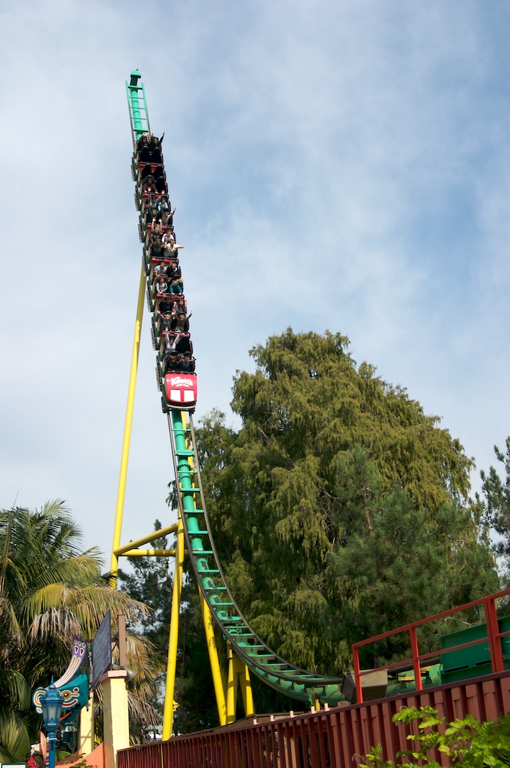 Knott’s Berry Farm’s version was the second-generation version of this ride system, which featured a large fly-wheel that physically pulled the train slightly faster to reach a top speed of 55 mph in less than five seconds. With a clever play on words for its name, Montezooma’s Revenge opened to the public on May 25, 1978. Several more of these rides were built around the country and overseas, but today, Montezooma’s Revenge is the last of these rides still operating in the United States and is the longest standing in its original location, having never been moved. Several more coasters have been added to Knott’s Berry Farm since, with even one of the newer coaster’s track — Jaguar! — intersecting directly through Montezooma’s Revenge vertical loop, giving passengers on both coasters an added thrill.