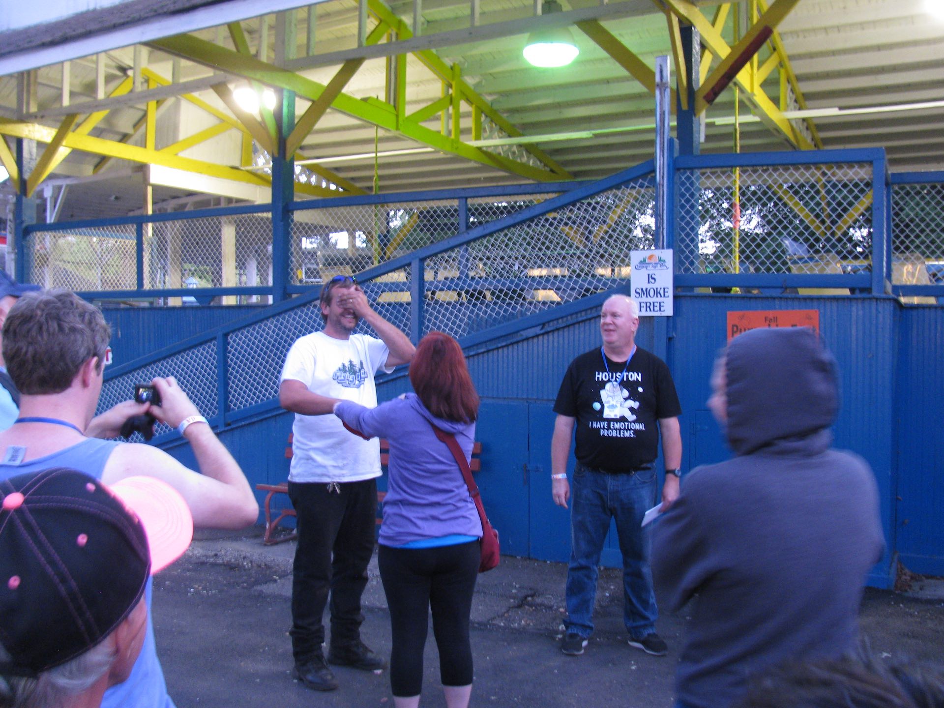 At 5 p.m. everyone gathered again at the Blue Streak pavilion for a delicious dinner of pasta, sides and brownies. Lenny Adams, the park’s tireless maintenance manager and park cheerleader, thanked attendees for coming and posed with the park’s mascot, Connie Otter (aka one of his daughters). Connie’s escort was none other than his other daughter! Because at least six submissions identified all the scavenger hunt photos correctly, Adams had to draw for the season pass winner: WNYCC Webmaster Bob Wheeler (who handled registration for the event) and Membership Director Yvonne Wheeler, who submitted a joint entry.