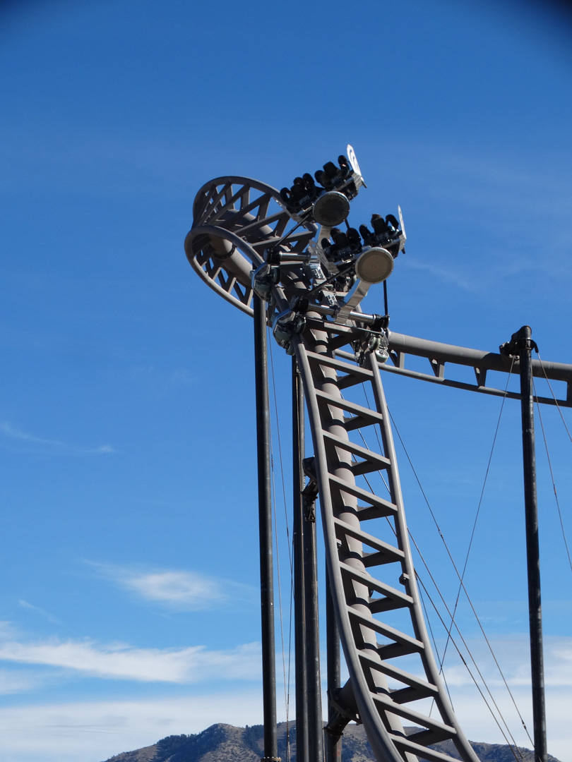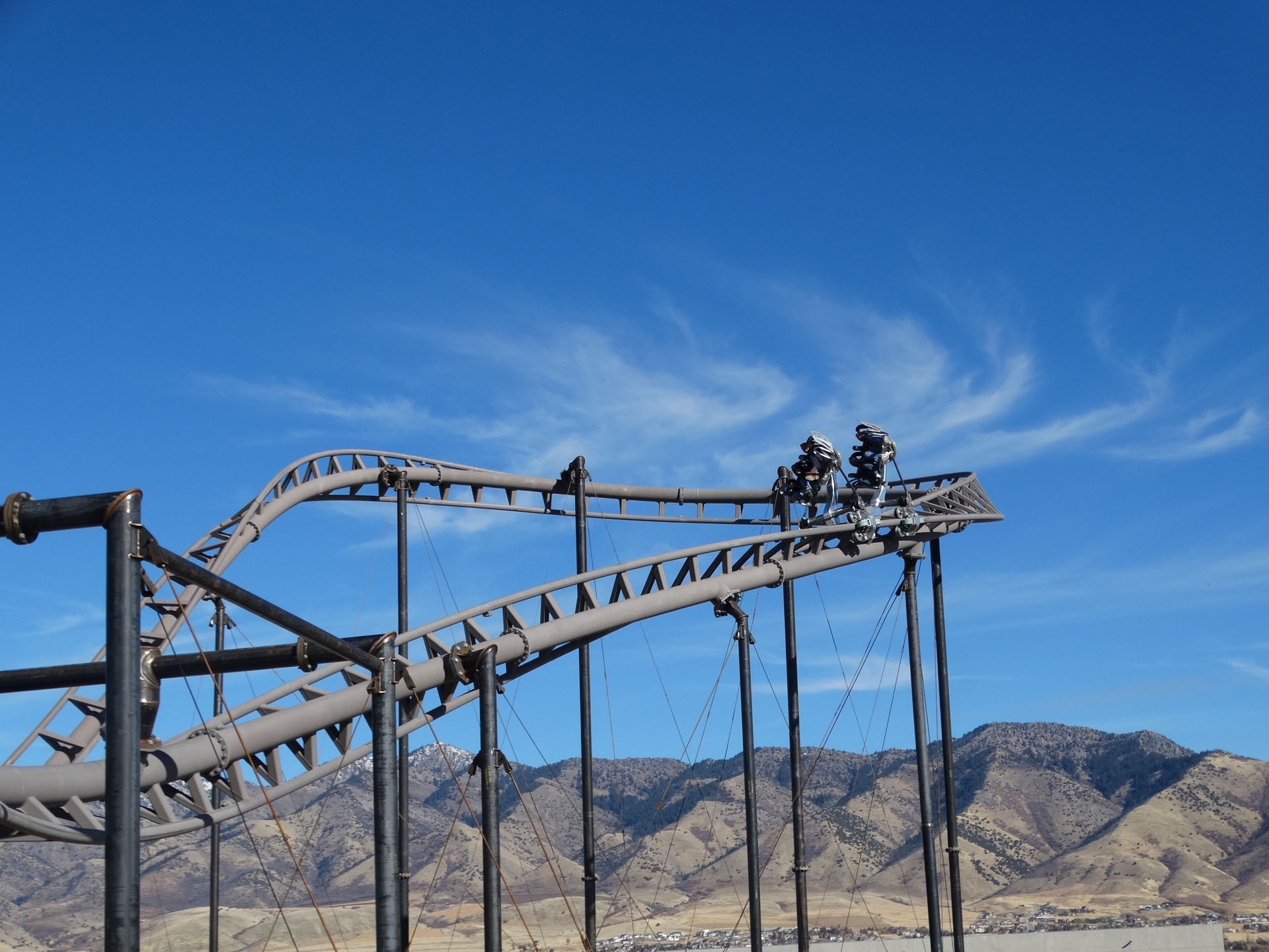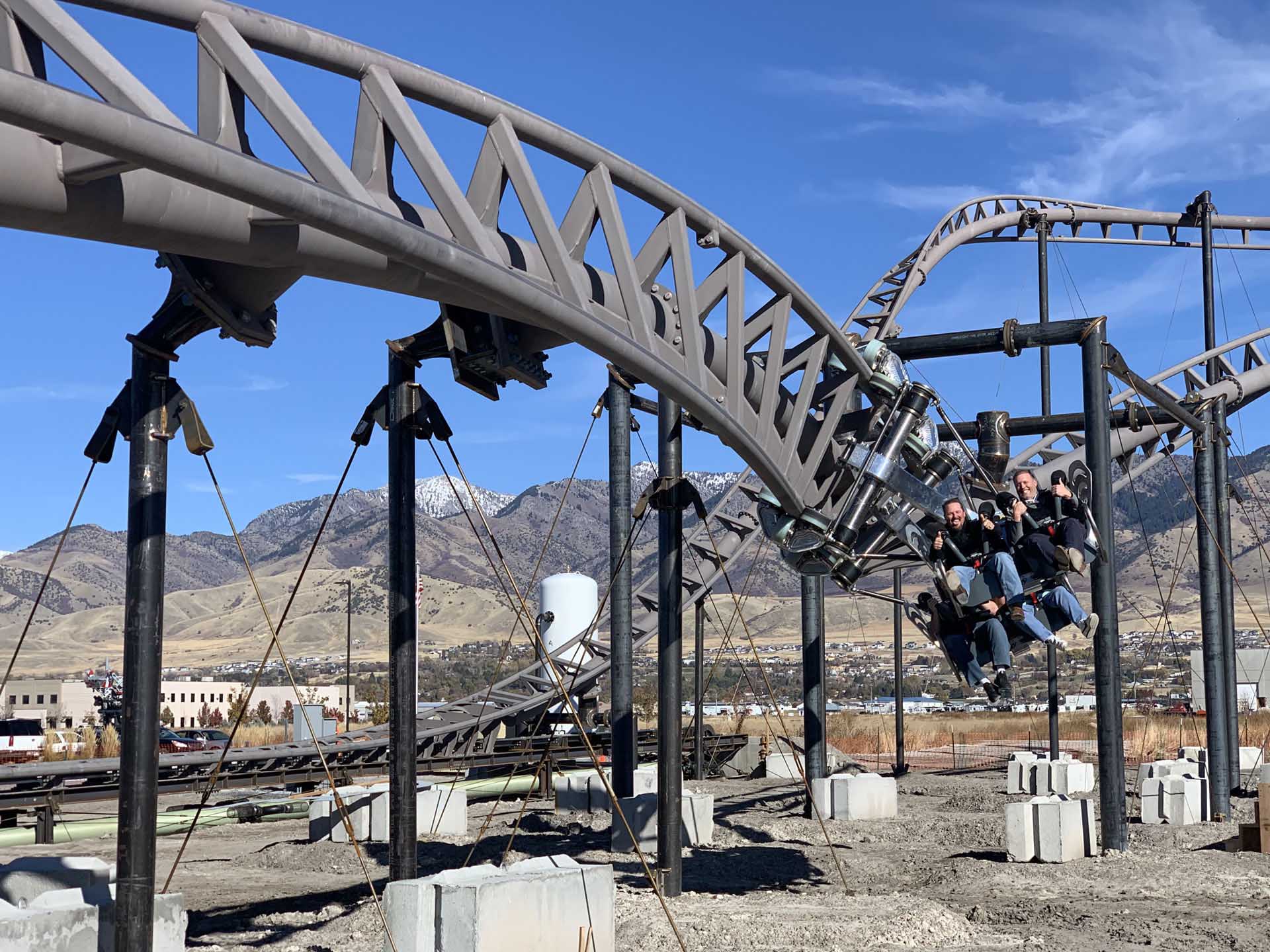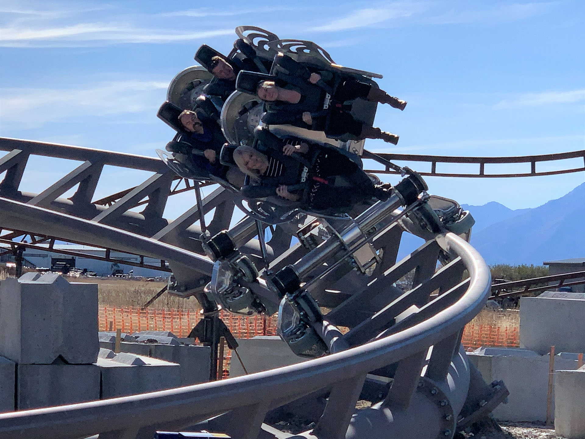 Axis throws the doors wide open. Test track at the North Logan facility in Utah has the vehicles closer to the track and not initially extended to the sides. More dramatic maneuvers can initiate flips — in a direction no coaster has ever gone before. The track layouts are limitless as any park can customize what the coaster does simply by twisting the track and letting riders rotate around it, which illustrates Axis’ most signature attribute. On any other coaster, a rider can look at the track ahead and anticipate what will take place next. Because of the unpredictable nature of the swinging and rotation around the track, Axis delivers surprising motions. Fortunately, it is orchestrated marvelously with a fluid smoothness.