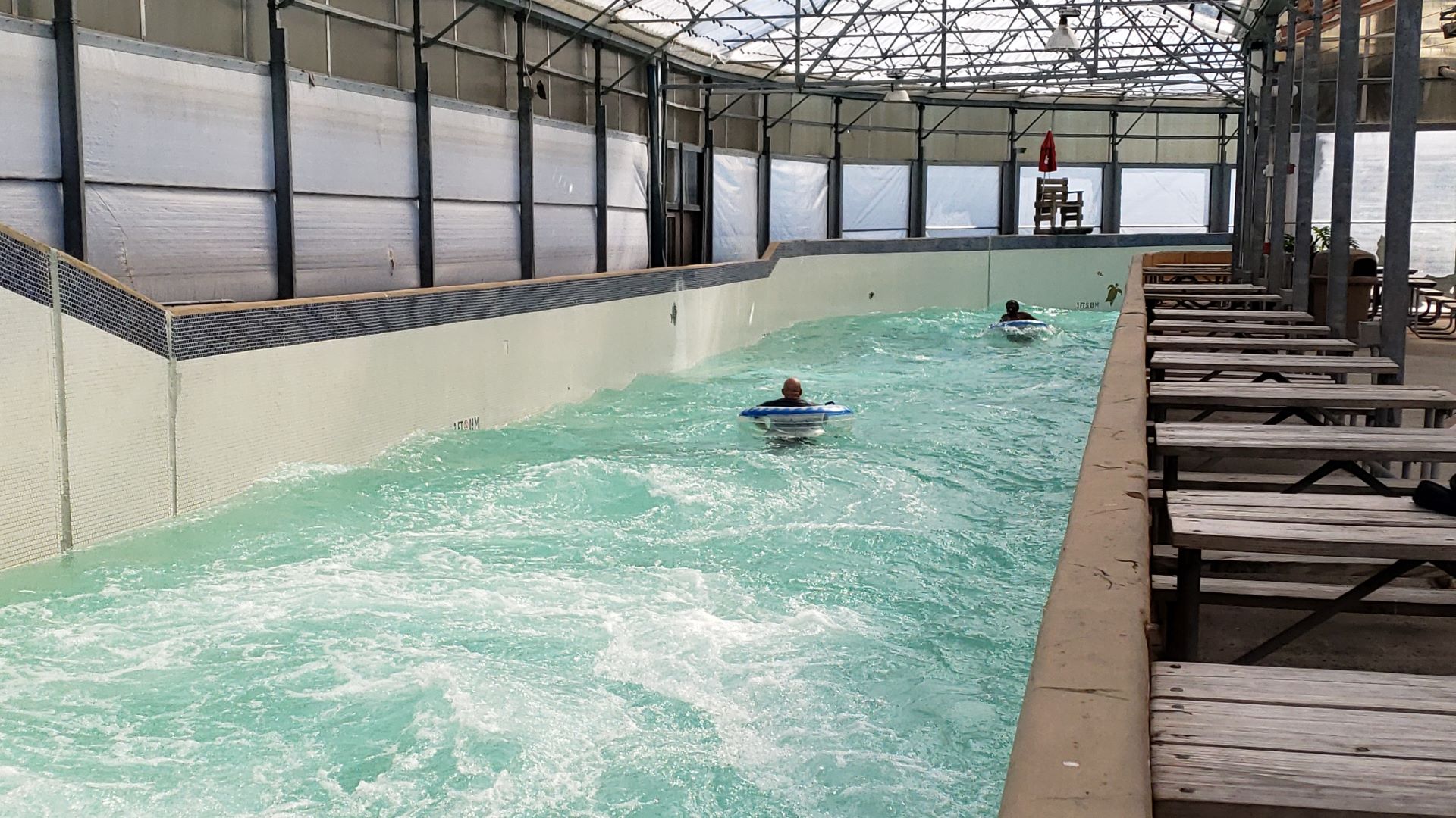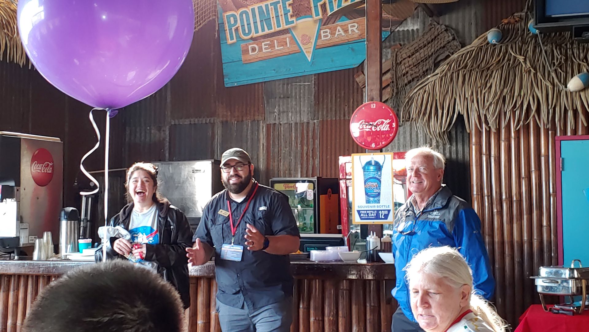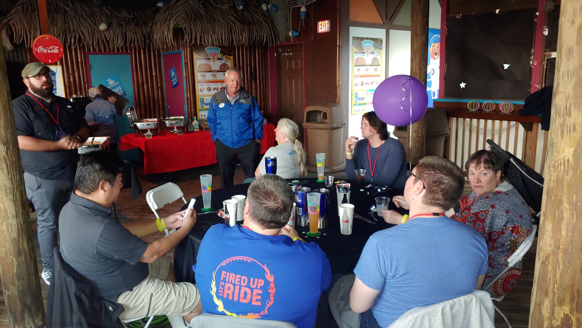 As evening approached, everyone slowly made their way back to Pointe Pizza to dry off, warm up and wait for dinner. As always, the park provided a wonderful meal to end the event. Attendees enjoyed bacon-wrapped pork loin, bacon-wrapped turkey legs and numerous sides, plus an Oreo parfait for dessert. Adult beverages were also provided for those who wanted them. During dinner the park staff spoke to the group once again and reassured everyone that Schlittercon will take place in New Braunfels on Memorial Day weekend and Beach Con will happen at the Galveston park on Labor Day weekend. The regional rep team wrapped things up by discussing the upcoming events and some of the planning for 2020 events.