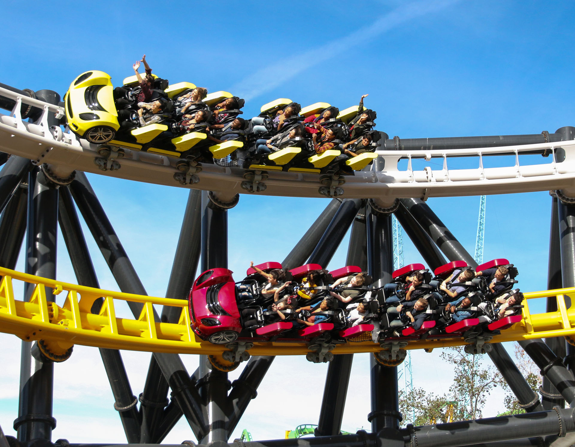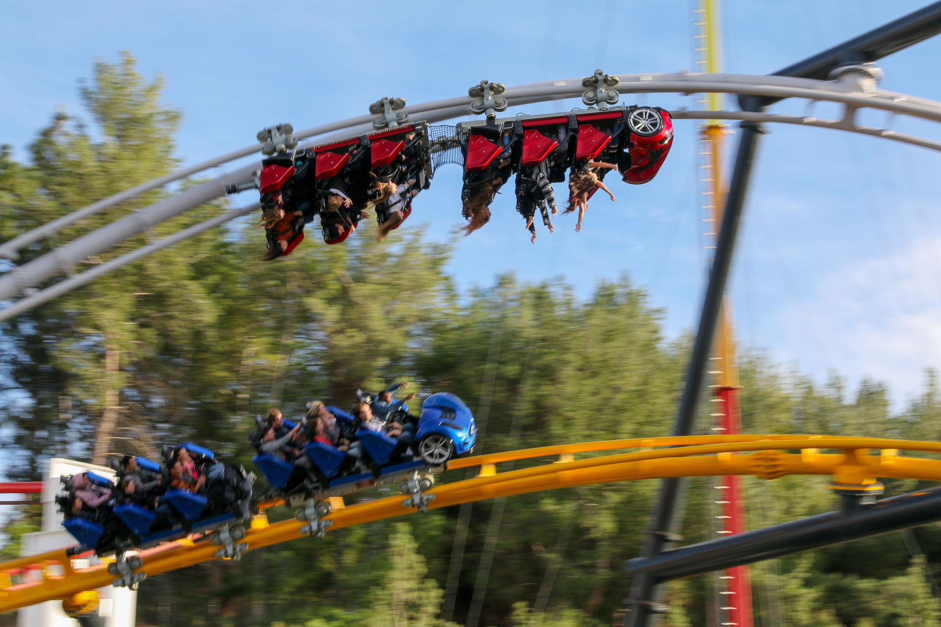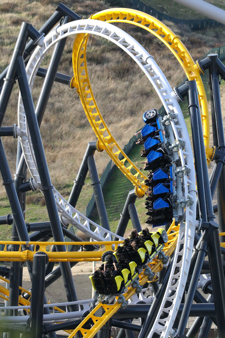 The Southern California theme park already features a roller coaster with a Möbius strip design, Twisted Colossus by RMC, and a multi-launch coaster, Full Throttle by Premier Rides. Twisted Colossus, a hybrid revamp of the original Colossus is praised for its long duration, strong airtime and a plethora of elements. Full Throttle’s 160-foot loop with a top hat boldly lines the park and draws in crowds right by the entrance. West Coast Racers seems to combine the two coasters’ famous elements, yet it brings a different experience to the park’s coaster lineup. Twisted Colossus is admired for hitting all of the marks of a good coaster: lots of airtime, a long duration, inversions and a great drop. However, West Coast Racers, which is mainly based on the interaction between the two sides of the track, has more of a fun and relatively family-friendly feeling when compared with Twisted Colossus. At a maximum height of only 67 feet, the coaster stays relatively close to the ground to give riders the feeling of racing on a street.