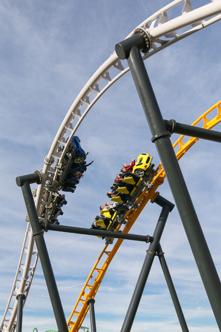 West Coast Racers includes a Möbius strip design, in which riders get two laps around the layout instead of one. The white and yellow twin tracks interact with each other 30 times with 14 crossings. A pit stop located next to the load station marks the halfway point of the ride. To begin, trains roll out from both sides and encounter a linear synchronous motor (LSM) launch, sending them into a high-five element. Although riders aren’t close enough to touch each other’s hands, the element is a strong moment of lateral ejector airtime. The white side then encounters a zero-G stall, as seen on multiple coasters by Rocky Mountain Construction (RMC), including Twisted Colossus, while the yellow side turns and goes over a small airtime hill. Side by side, the trains are launched with an LSM boost and then rise through interlocking corkscrews. The white track forcefully twists and turns with a few minor pops of airtime before entering the pit stop where riders prepare to experience the yellow side. The yellow side goes through a similar spaghetti bowl but includes another corkscrew.