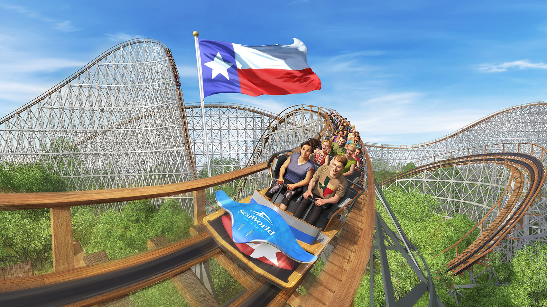 Texas Stingray, built by Great Coasters International, Inc., features a drop of 100 feet, with 15 airtime hills and a 100-foot-long tunnel. The top speed of “the tallest, fastest and longest wooden coaster in Texas” is 55 mph. The new 3,379-foot-long ride will be SeaWorld’s sixth coaster.