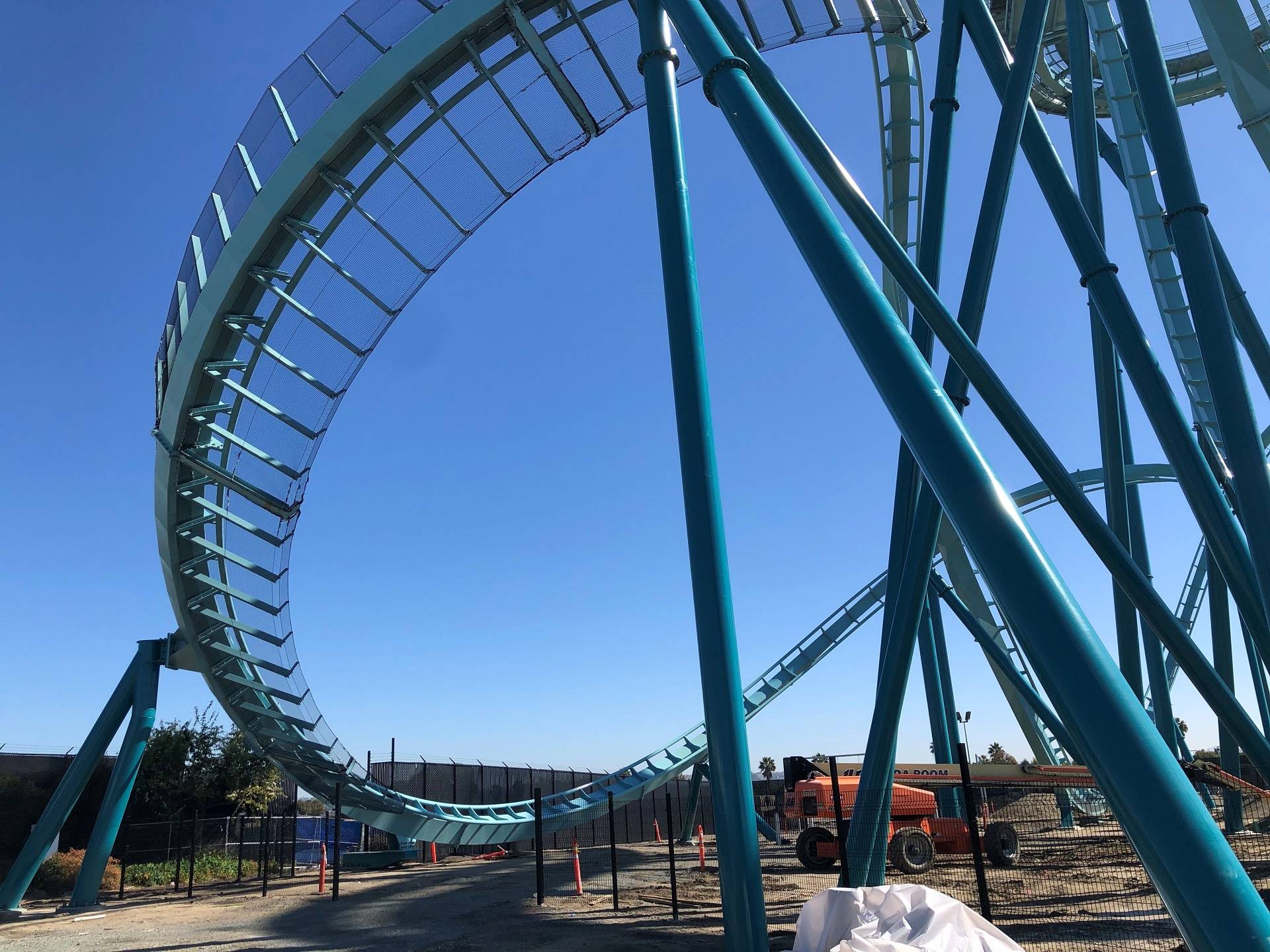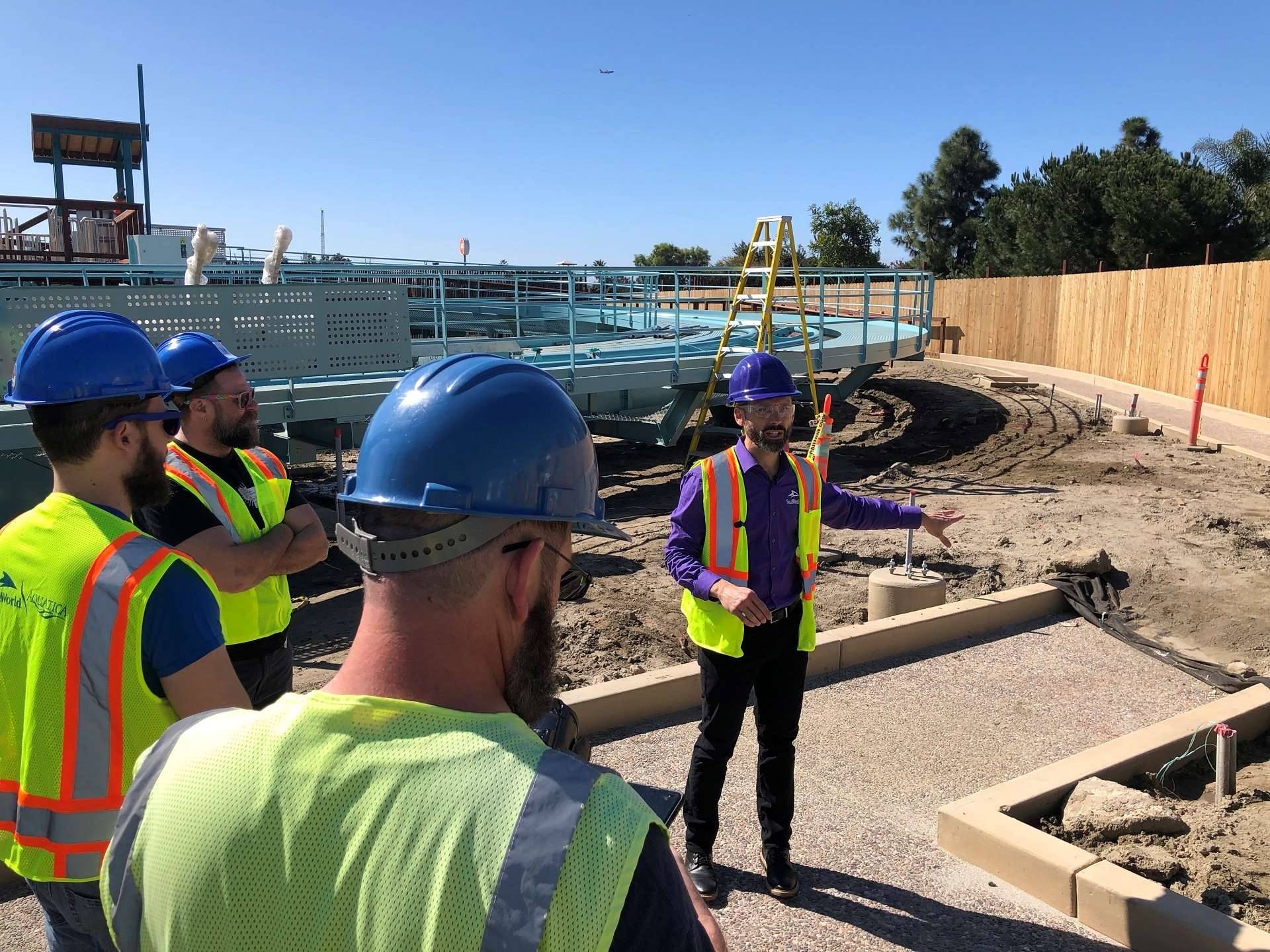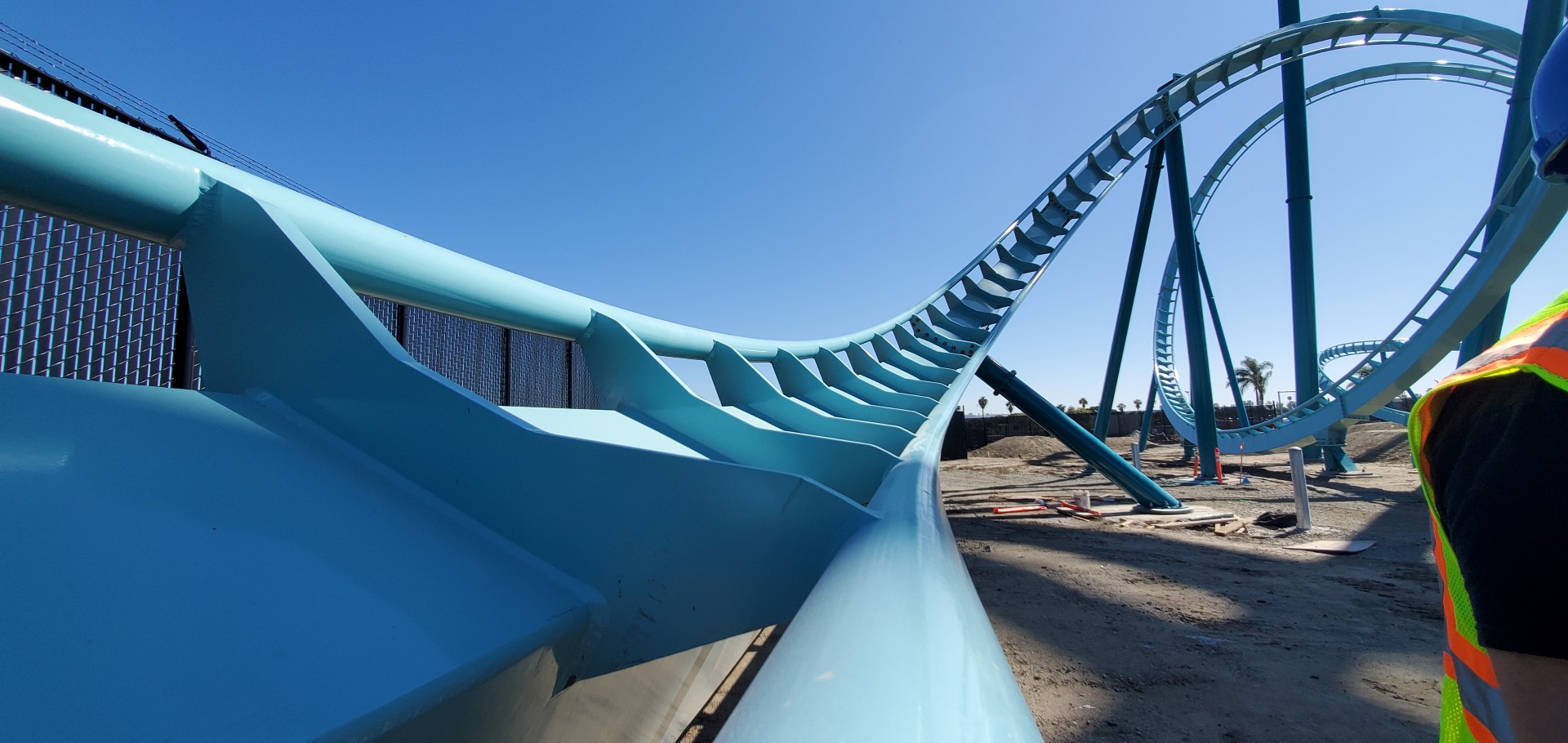 On the bright, warm morning of February 25, a few lucky Southern California ACEers were treated to a hard-hat tour of SeaWorld San Diego’s newest addition, the dive coaster Emperor, slated to open in spring 2020. Attendees were first treated to a short presentation on the background and specifics of the new coaster — billed as the tallest and fastest dive coaster in California— by SeaWorld Parks and Entertainment’s Corporate Vice President of Attractions Mike Denninger. Emperor begins with a 153-foot drop which results in a speed of 60 mph. This plunge is followed by a quick series of four inversions before finally hitting the brake run. The inversions are listed as an Immelmann, hammerhead, barrel roll, and flat spin. However, to this author’s eye, what is called a flat spin is not a typical corkscrew-type inversion but instead a sort of twisted Immelmann. The hammerhead is an overbanked turnaround but does appear to the naked eye to be more than 135 degrees. Whatever the names of the inversions, Emperor looks to be a seriously fun and peppy ride!