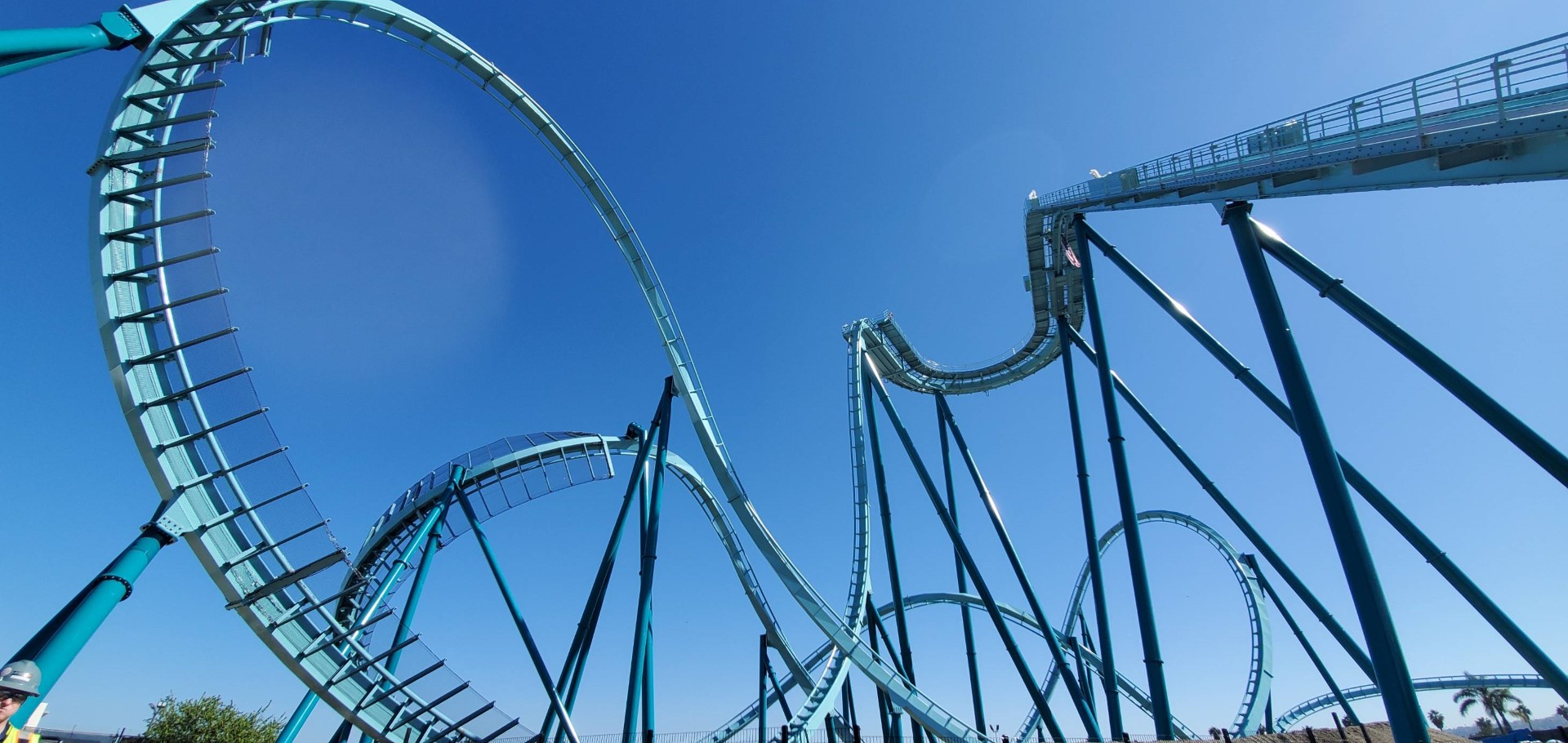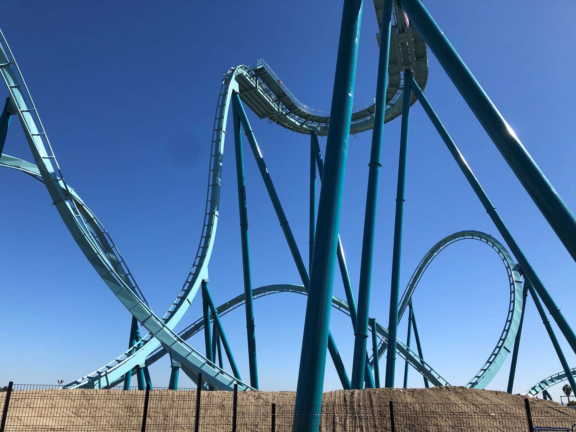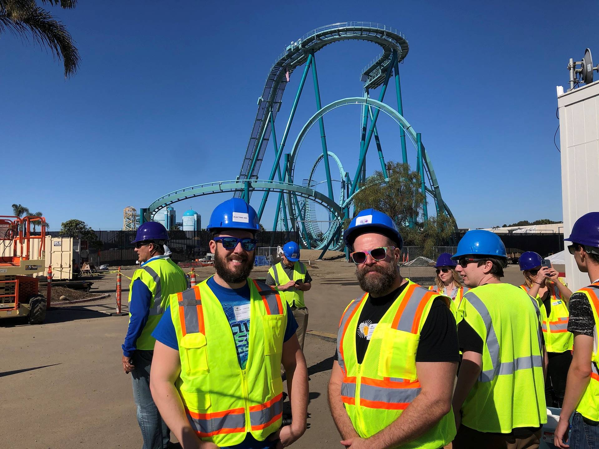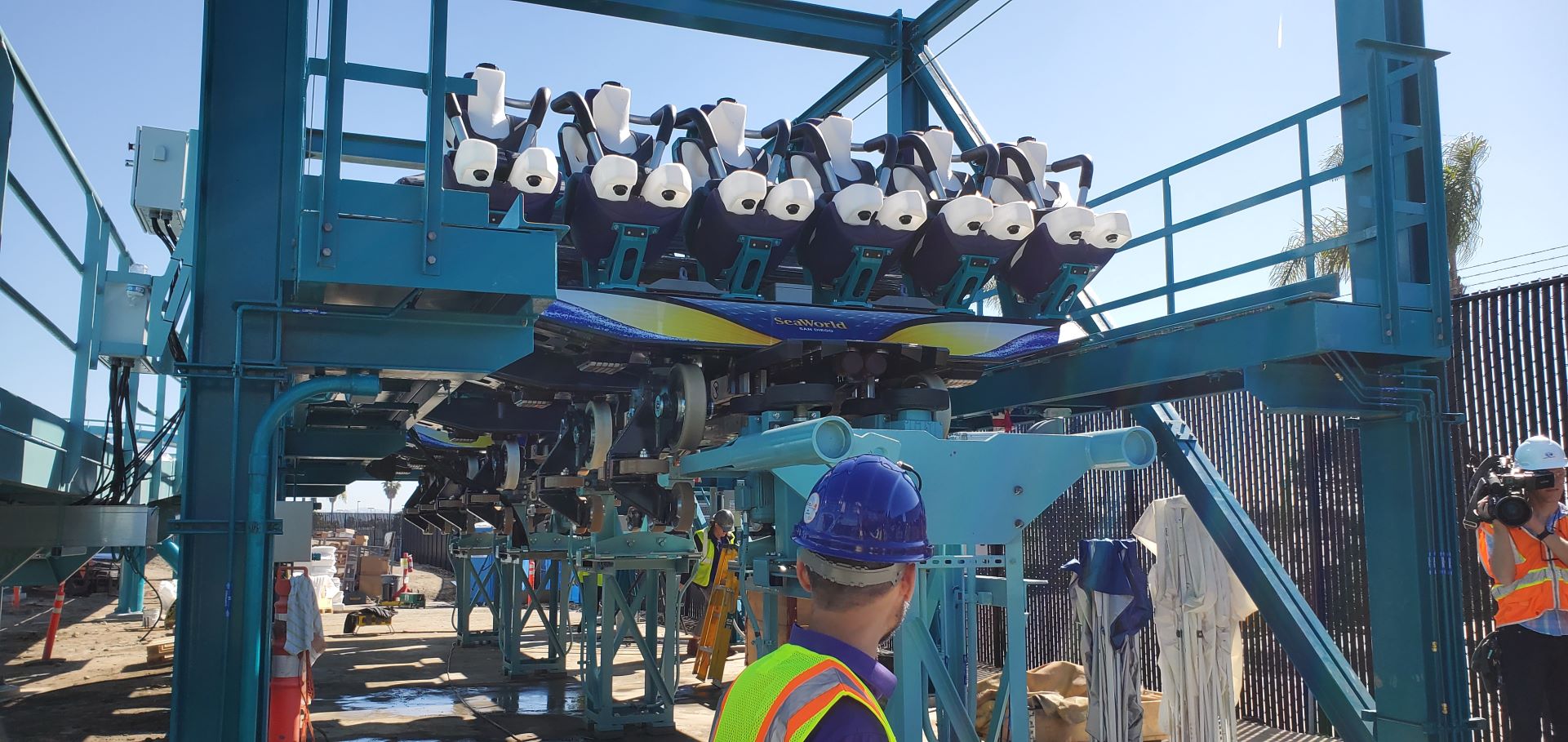 On the bright, warm morning of February 25, a few lucky Southern California ACEers were treated to a hard-hat tour of SeaWorld San Diego’s newest addition, the dive coaster Emperor, slated to open in spring 2020. Attendees were first treated to a short presentation on the background and specifics of the new coaster — billed as the tallest and fastest dive coaster in California— by SeaWorld Parks and Entertainment’s Corporate Vice President of Attractions Mike Denninger. Emperor begins with a 153-foot drop which results in a speed of 60 mph. This plunge is followed by a quick series of four inversions before finally hitting the brake run. The inversions are listed as an Immelmann, hammerhead, barrel roll, and flat spin. However, to this author’s eye, what is called a flat spin is not a typical corkscrew-type inversion but instead a sort of twisted Immelmann. The hammerhead is an overbanked turnaround but does appear to the naked eye to be more than 135 degrees. Whatever the names of the inversions, Emperor looks to be a seriously fun and peppy ride!