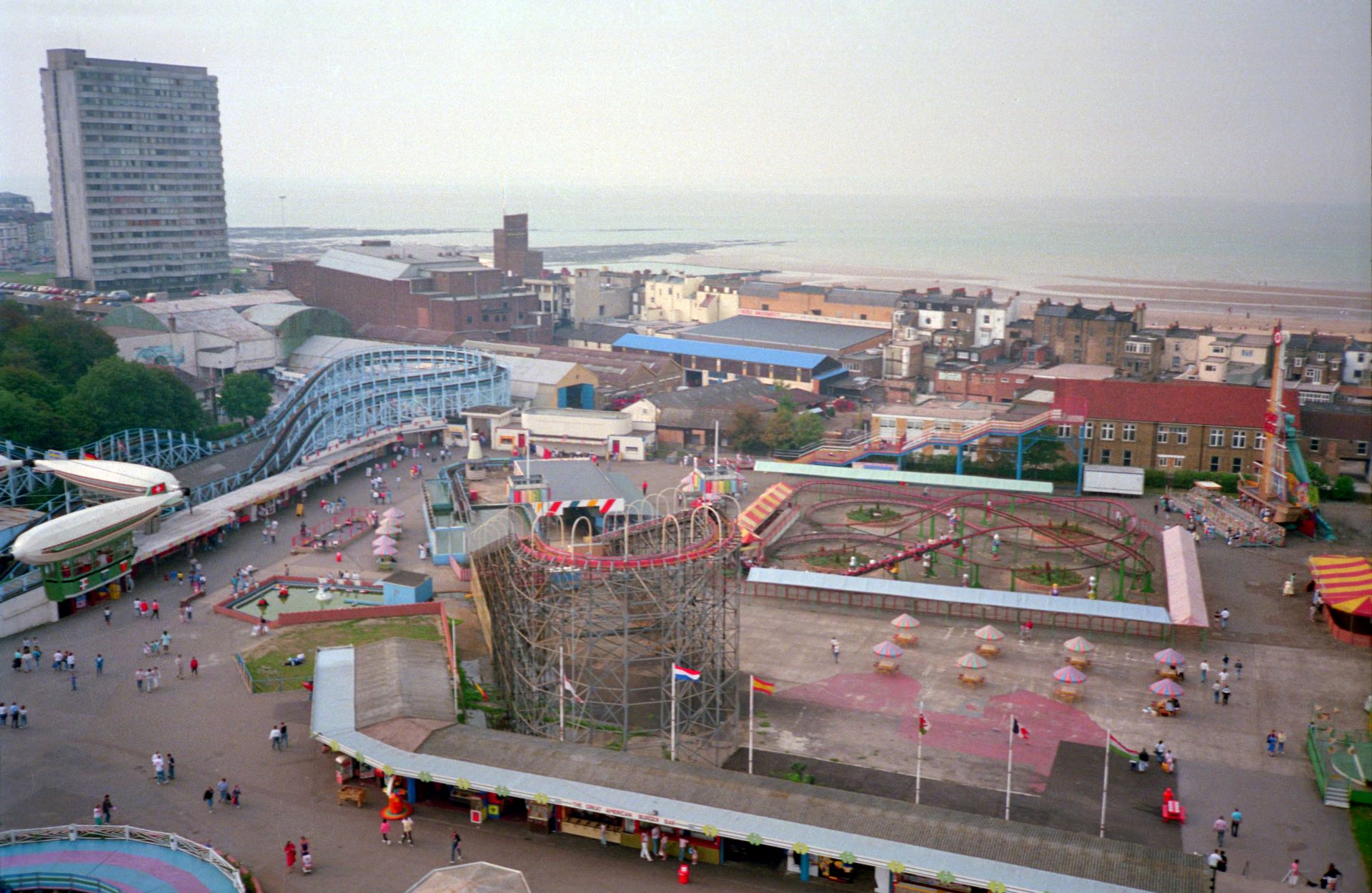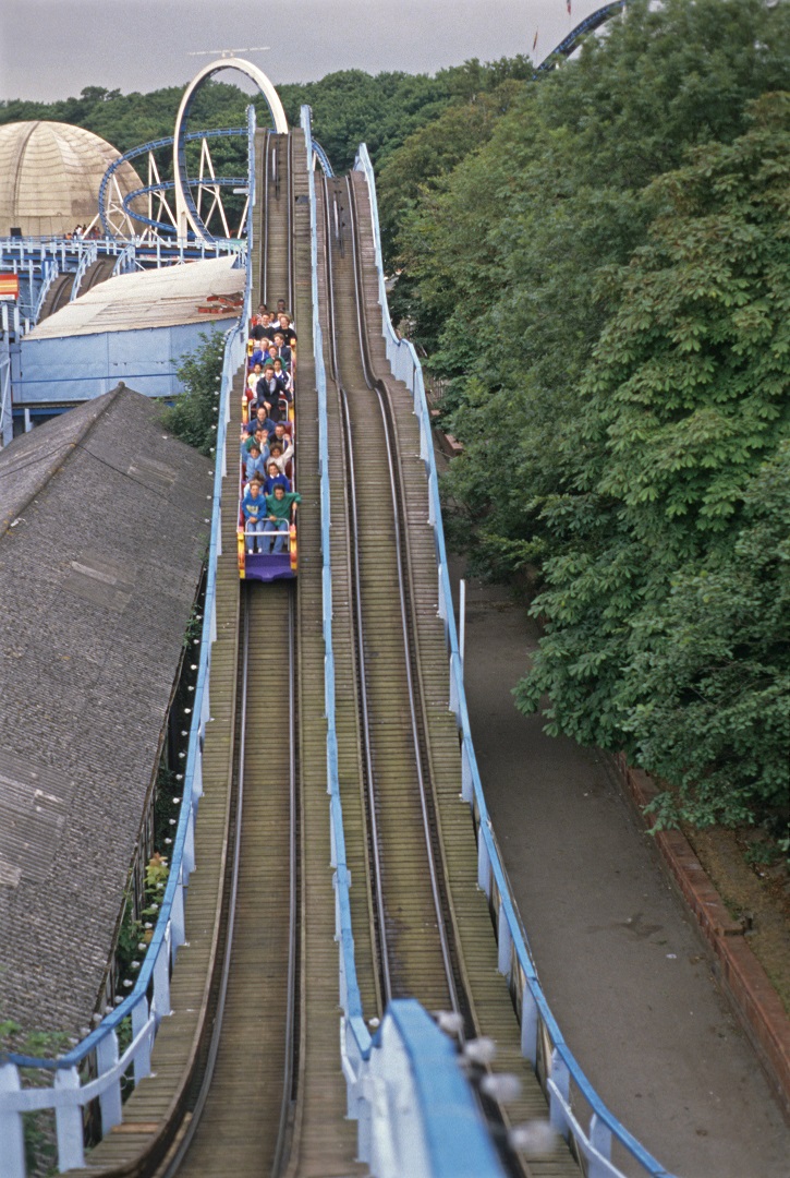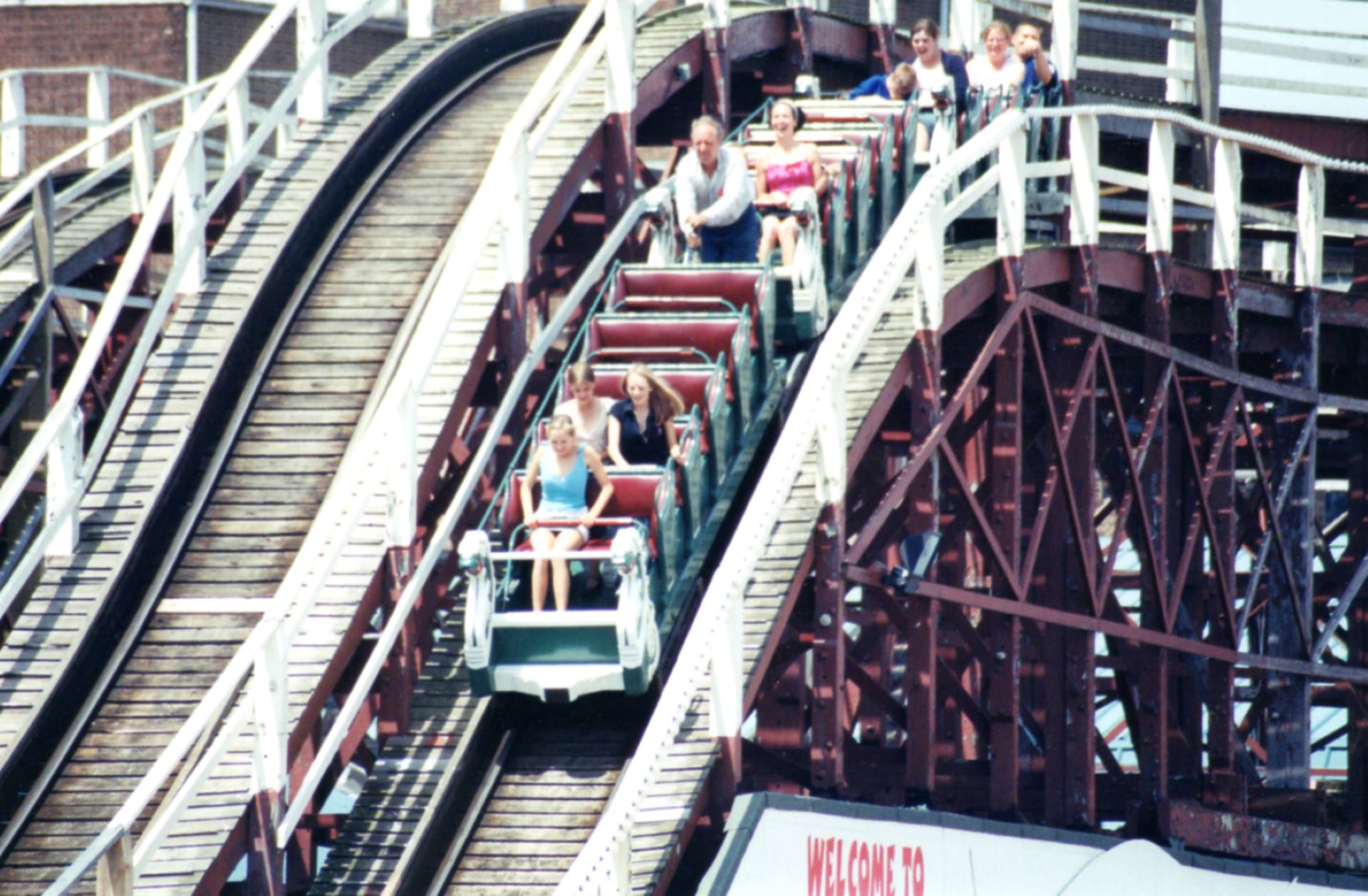 Scenic Railway’s gently thrilling, yet deceptively lengthy, double out-and-back choreography successfully mesmerized riders of all ages until the first closure of the park in 1938 owing to it passing into liquidation, an unfortunate development that may nevertheless have somewhat fortuitously coincided almost exactly with the outbreak in Europe of World War II. Dreamland reopened in 1946 under the ownership of Billy Butlin, an individual probably largely unheard of in North America but whose business acumen, along with an apparent capacity to see into the future, single-handedly shaped the manner in which the populace spent its newfound leisure hours and disposable income in post-war England every bit as much as did that of a certain Walt Disney in the United States. While other rides and attractions came and went as the decades passed, the majestic Scenic Railway continued to proudly serve as a baby boomer rite of passage, in particular for generations of residents of London and the southeast corner of the country, through a variety of park owners and incarnations. Indeed, its name and image were seemingly indelibly branded onto the very social fabric of the era. Almost every citizen of the United Kingdom, even those who had never felt even the slightest inclination to venture as dangerously close to France as the windswept Kent coastline, was somehow at least vaguely familiar with it, possibly largely because of its frequent appearances as a backdrop in television shows and movies.