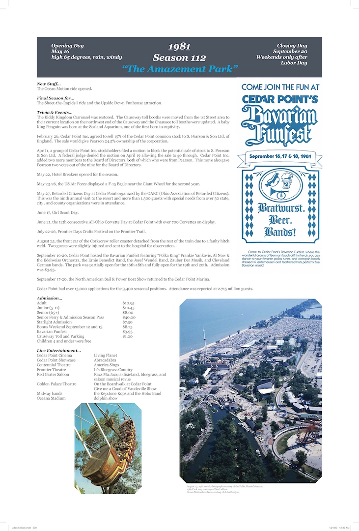 In honor of the park’s 150th anniversary celebration, author Ken Miller has accumulated an incredible amount of research and organized it into what is termed a Cedar Point atlas and chronology. Having spent seven years of work on the book, it is no surprise that the pages — just shy of 400 — are packed with a staggering volume of photos and information. Within the book, images of rides, the resort, boats, souvenirs and park maps are displayed with orchestrated finesse.
