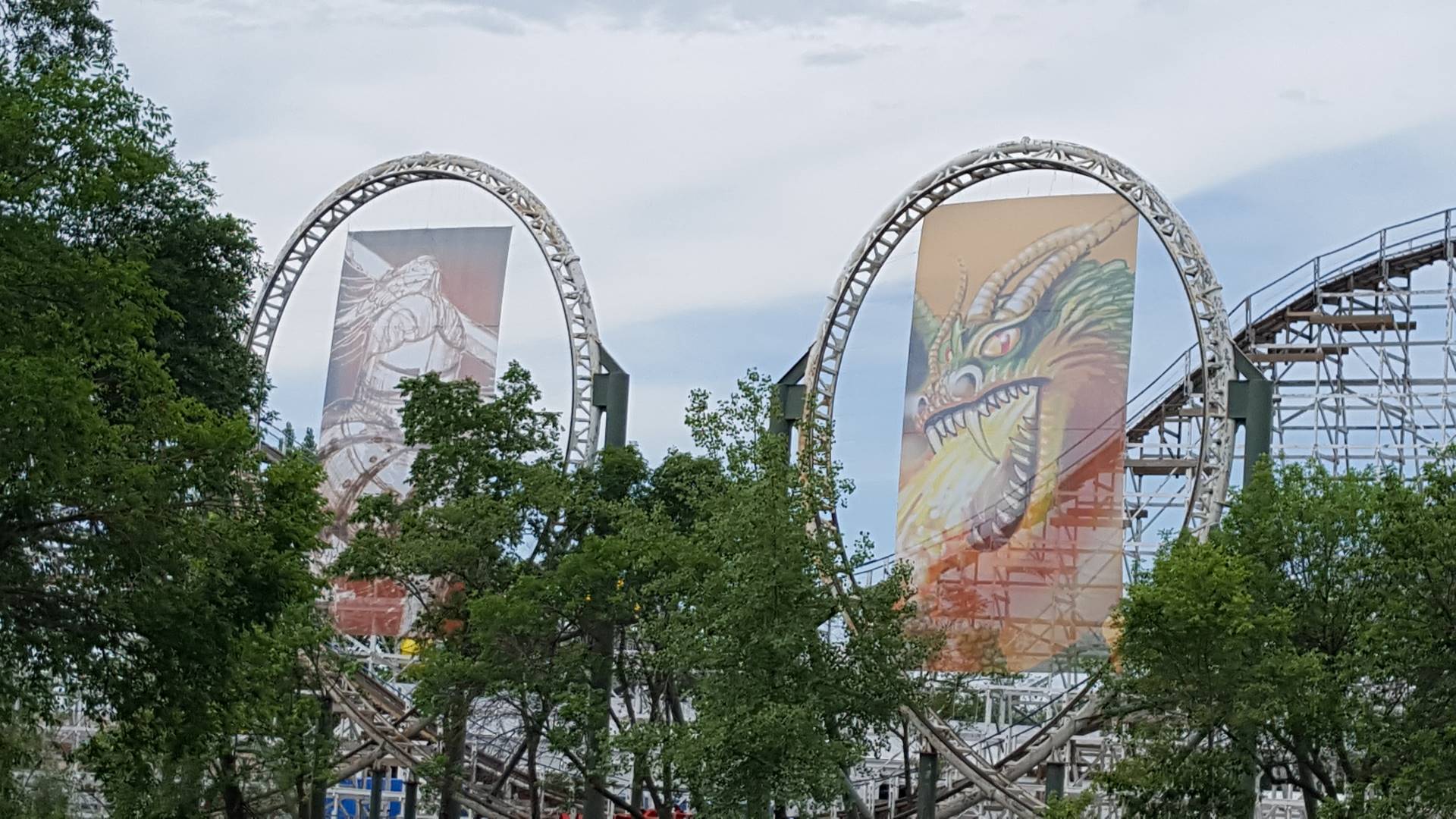 The two former loops of Dragon now hang banners promoting the upcoming Dragon Slayer.