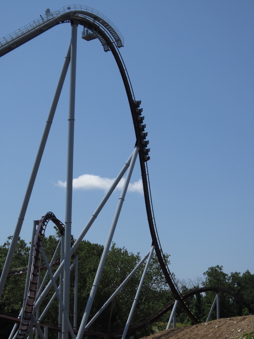 Immediately after leaving the station, the traditional chain lift carries the 28-seat train to the top of the 210-foot lift hill. Candymonium boasts the tallest in-the-park claim by just 10 feet over Skyrush, the Intamin hypercoaster that opened in 2012. After a split-second view at the top of the lift, the first drop plummets down at a 77.3-degree angle with a maximum speed of 76 mph. Once again, Candymonium barely broke the park’s record by just one mile per hour faster than Skyrush. After traveling on the 169-foot camelback hill with a 64-degree angle of the second drop, it races through the beautiful 123-degree hammerhead turn standing at 125 feet. On the return, riders climb beyond 100 feet once again as they rise into a 156-foot camelback hill with a 55-degree angle on the third drop. Without further ado, the train dashes over a high-speed airtime hill before entering the upward helix. At the top of the helix, a unique feature of the design is that the track slightly tilts to the left for a short time before swooping down and zipping into another airtime hill. The final feature is a panoramic banked curve around the new, iconic Kisses fountain before going through two camelback hills and hitting the brake run. Returning to the station, ACE members will applaud the ride’s pacing.