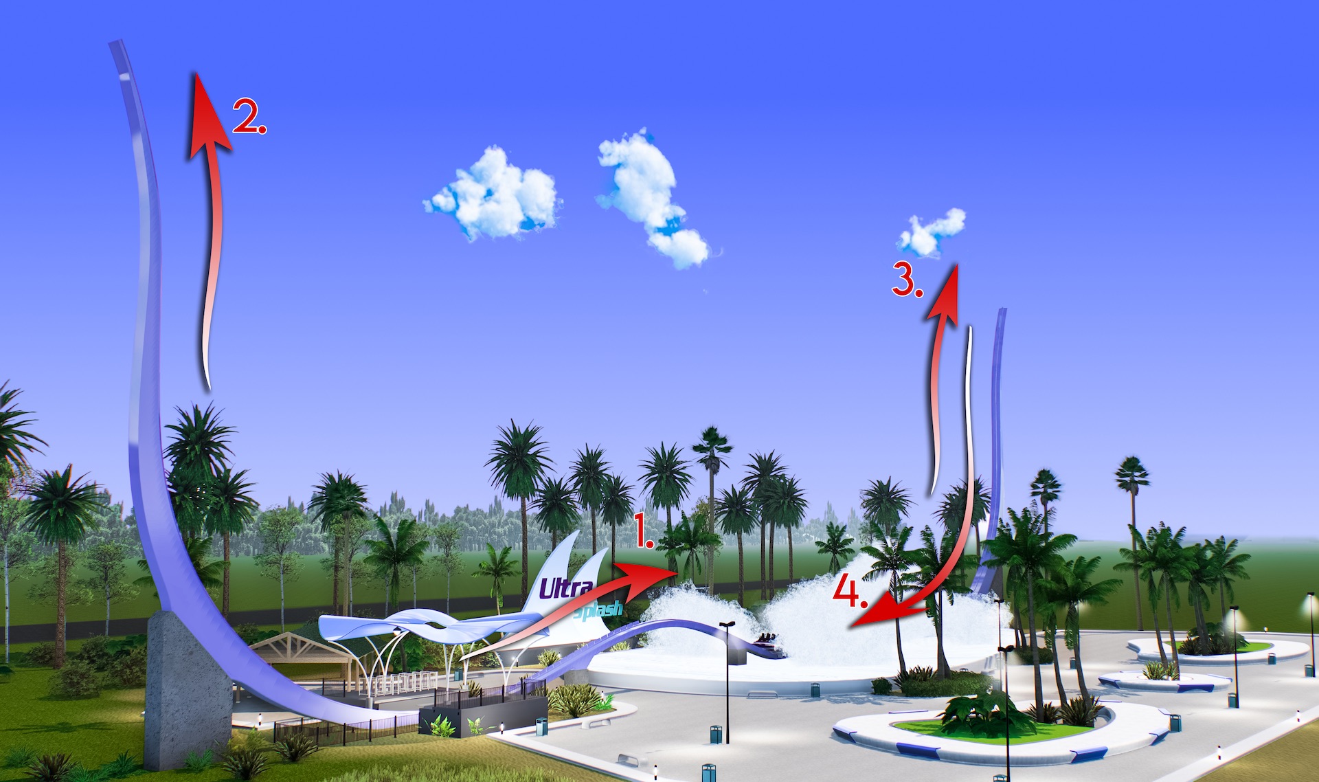 Ultra Splash also utilizes the single beam track. Its forward/backward shuttle experience has two curved reverse points, looking slightly dragon-like. On the third pass over the ride’s water reservoir, an entrenchment fills with water creating a traditional wall-of-water splash. Boats seat 24 people.