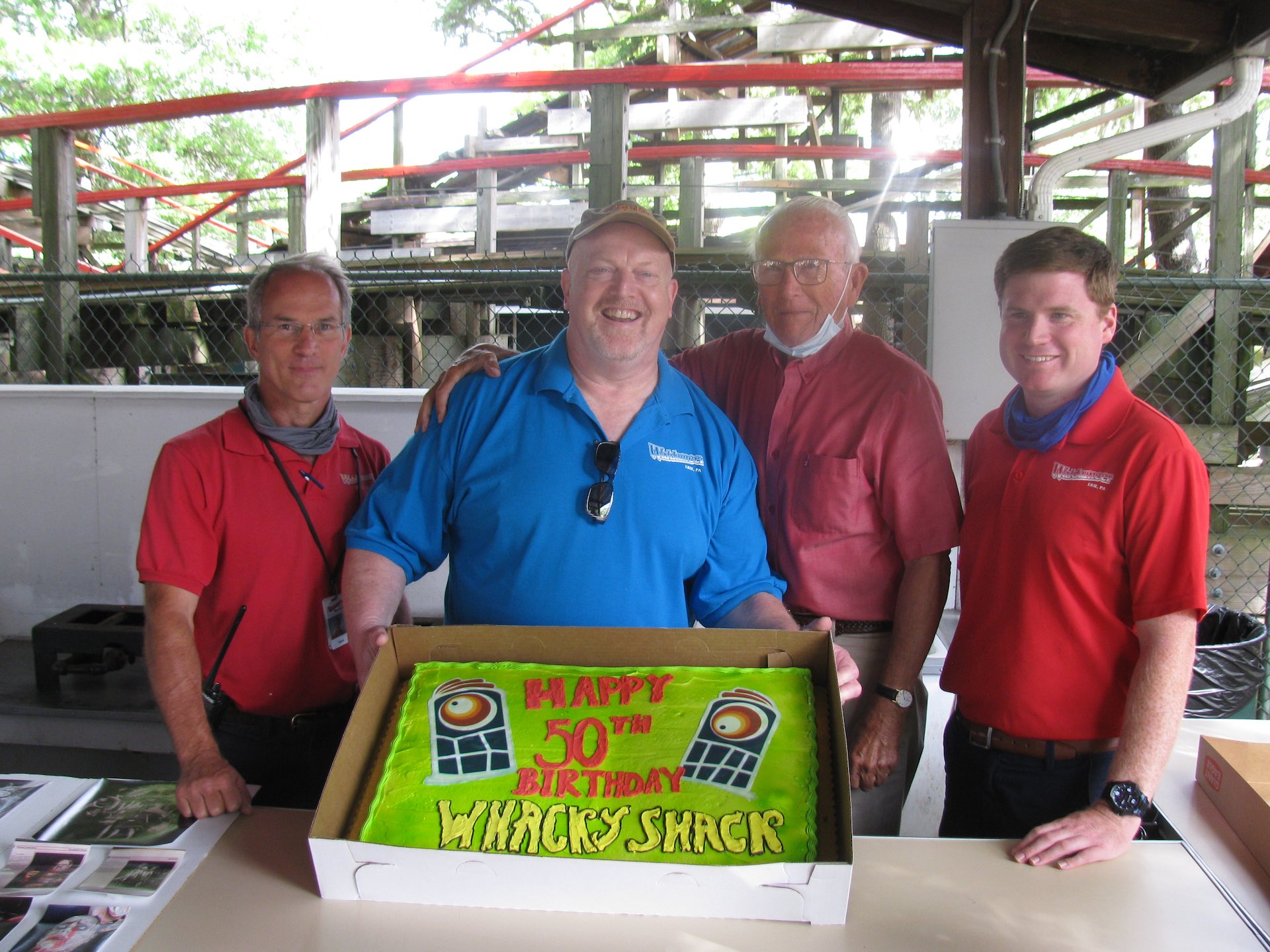 A real treat awaited attendees at 12:15 at the Coaster 1 pavilion for the Q&A with park management. Randy Skalos, a Waldameer employee who has helped restore Whacky Shack since 2008 and is often its ride operator, shared photos of this Bill Tracey-designed dark ride from its early years. In addition, the park provided a cake in honor of Whacky Shack’s 50th anniversary. Present for the cake cutting, in addition to Waldameer Owner Paul Nelson, President Steve Gorman and Skalos, was Perry Duncan, who, as a 27 year old, helped Bill Tracey build the ride in 1970.