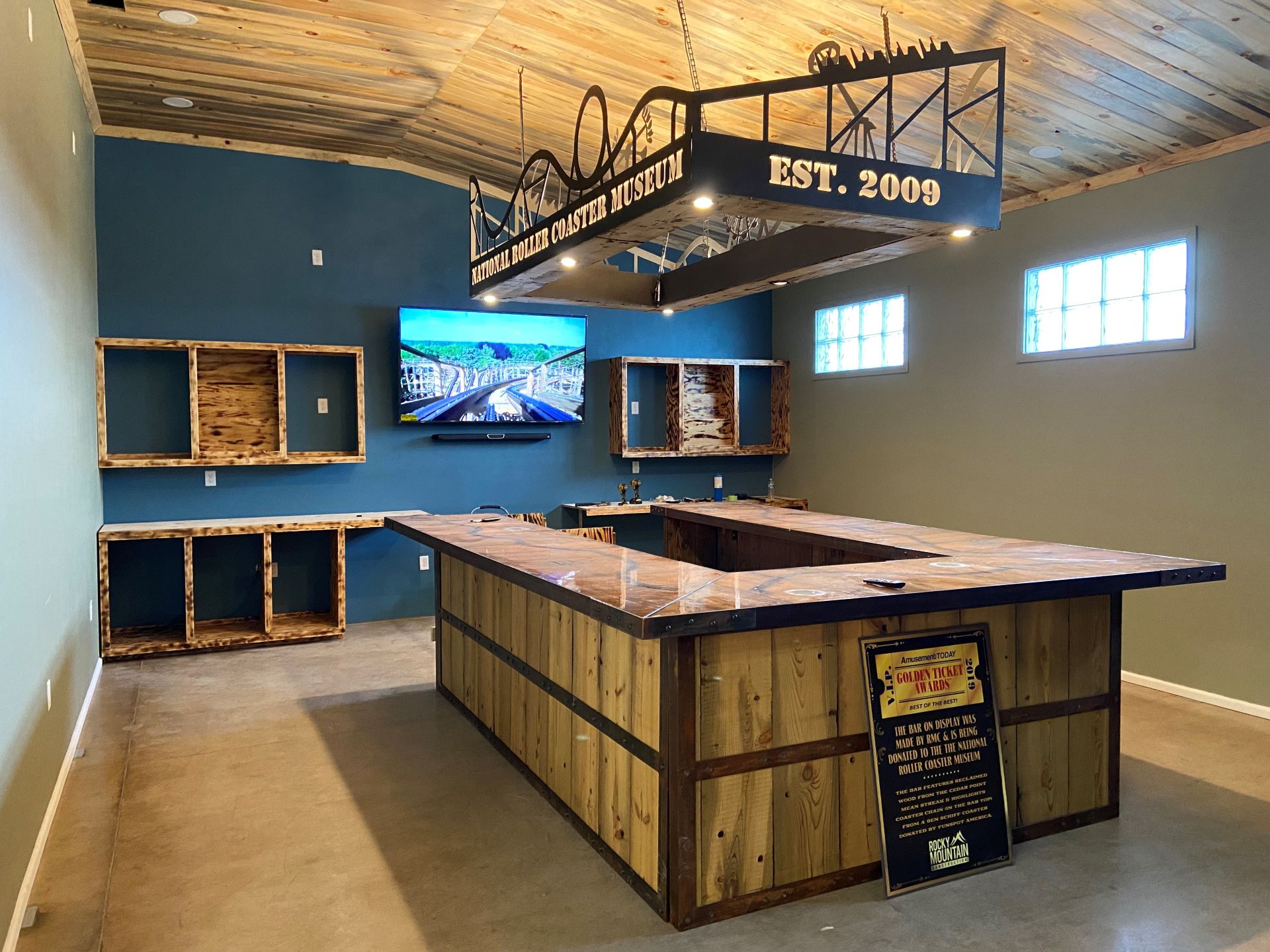 A bar/reception space is sure to be a hit with coaster fans. The entrance is a barn door created from Texas Cyclone wood, as well as rollers from Tilt-a-Whirl wheels. Rocky Mountain Construction (RMC) created the bar from reclaimed Mean Streak wood, and underneath the acrylic top, onlookers will see coaster parts from a Ben Schiff kiddie coaster from Fun Spot (Kissimmee, Florida) embedded into the wood. Hanging over the bar is a custom-designed lighting fixture from RMC made specifically for the NRCMA. The lighting fixture is backlit with LED so that colors can change. Lights recessed in Colossus wood within the chandelier shine down on the reception area. Signage within the room will note the specific Easter eggs within the room.