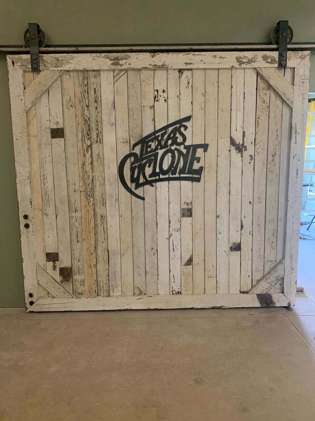 One of the portals is a barn door created from Texas Cyclone wood and Tilt-a-Whirl cars.