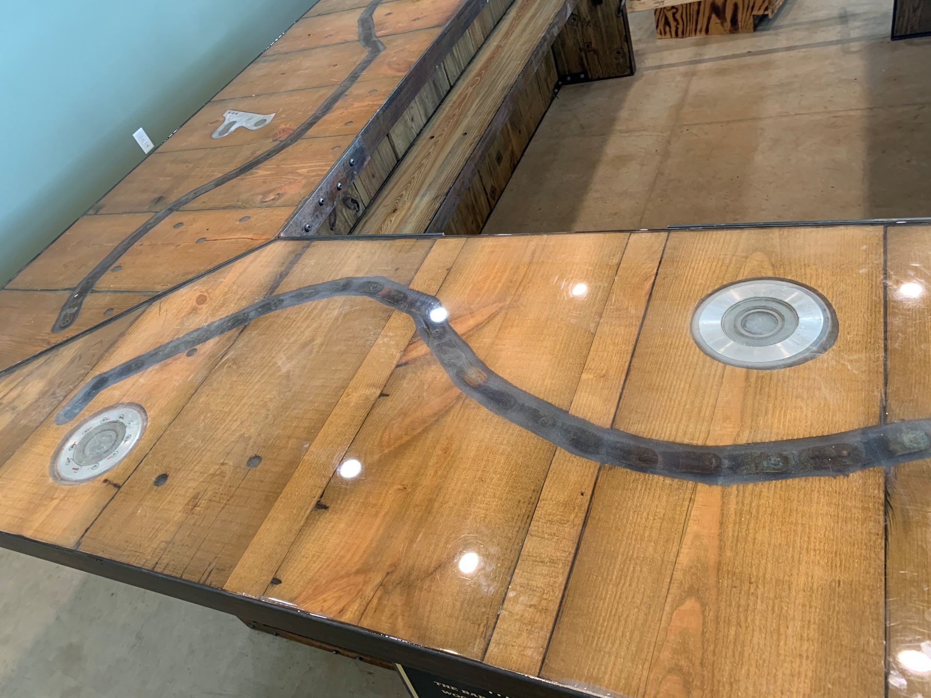 Parts from a Ben Schiff kiddie coaster are embedded into the wood below the acrylic surface.