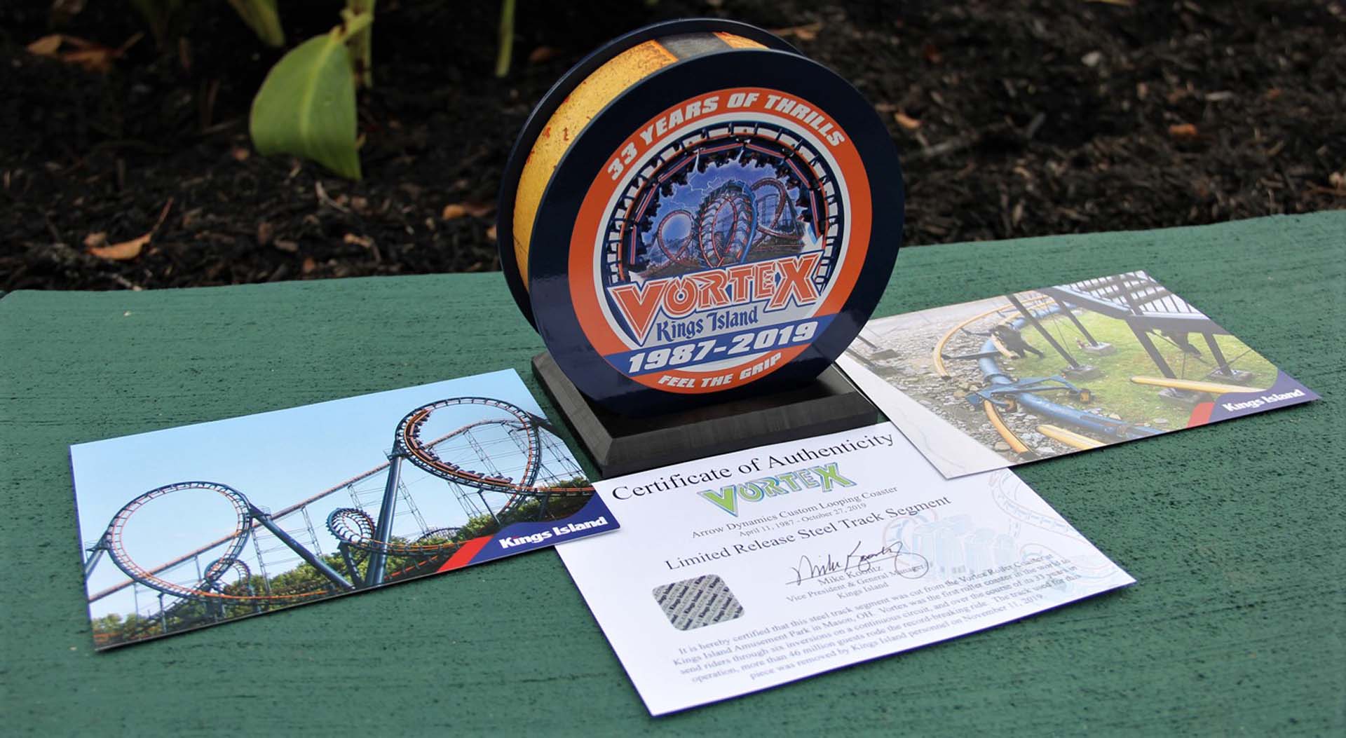 Fans of the six-inversion Arrow looper at Kings Island (Mason, Ohio) spared no expense in obtaining a piece of history. Vortex was introduced in 1987 and gave its final rides last fall. In an homage to the ride’s opening year, the collector’s package sold — and sold out — for $198.70. It included postcards, a 1.5-inch slice of Vortex track placed in a special display stand and a certificate of authenticity. The limited-edition collectable went on sale inside the park on October 3. On October 4, it officially sold out.