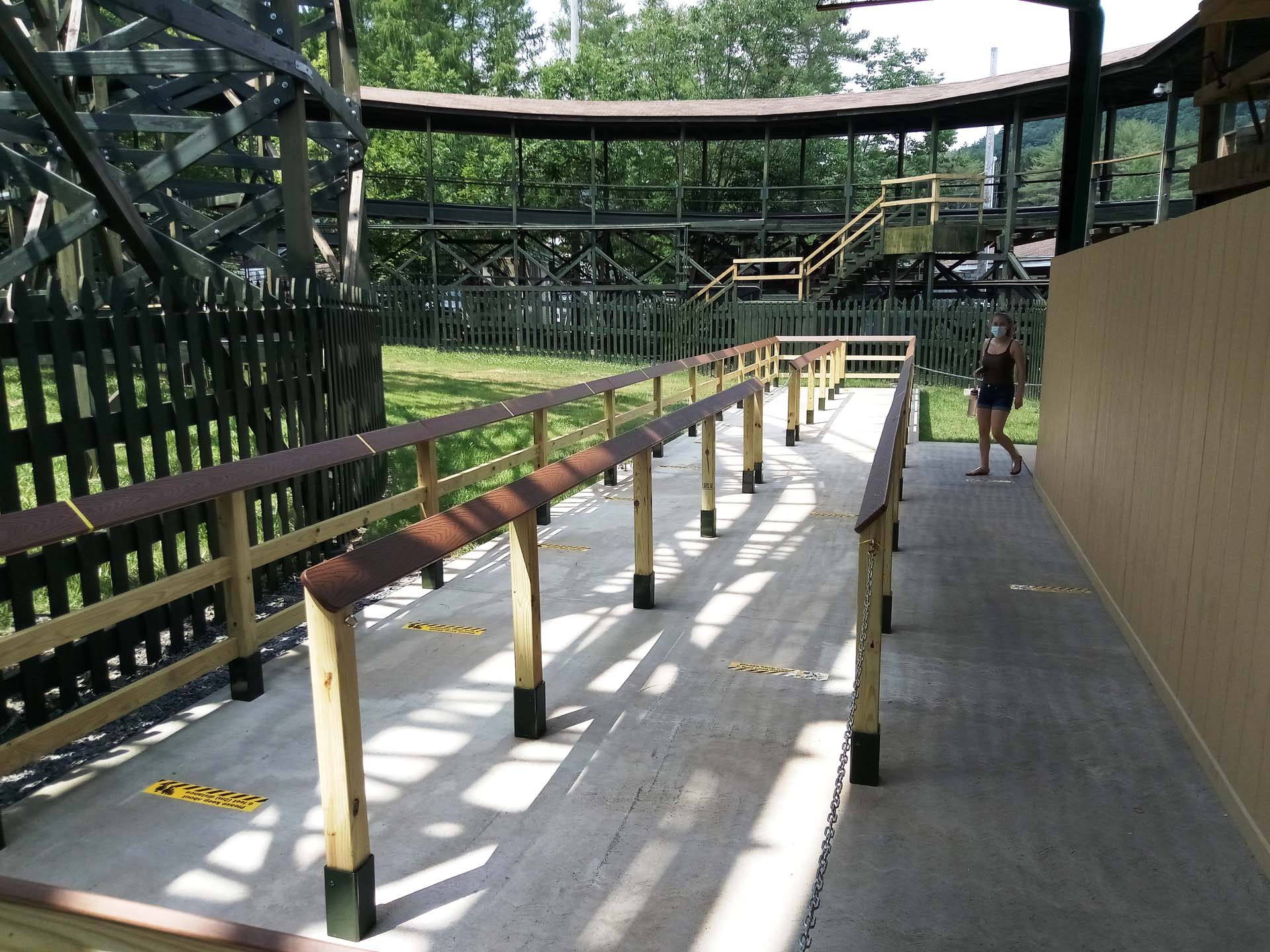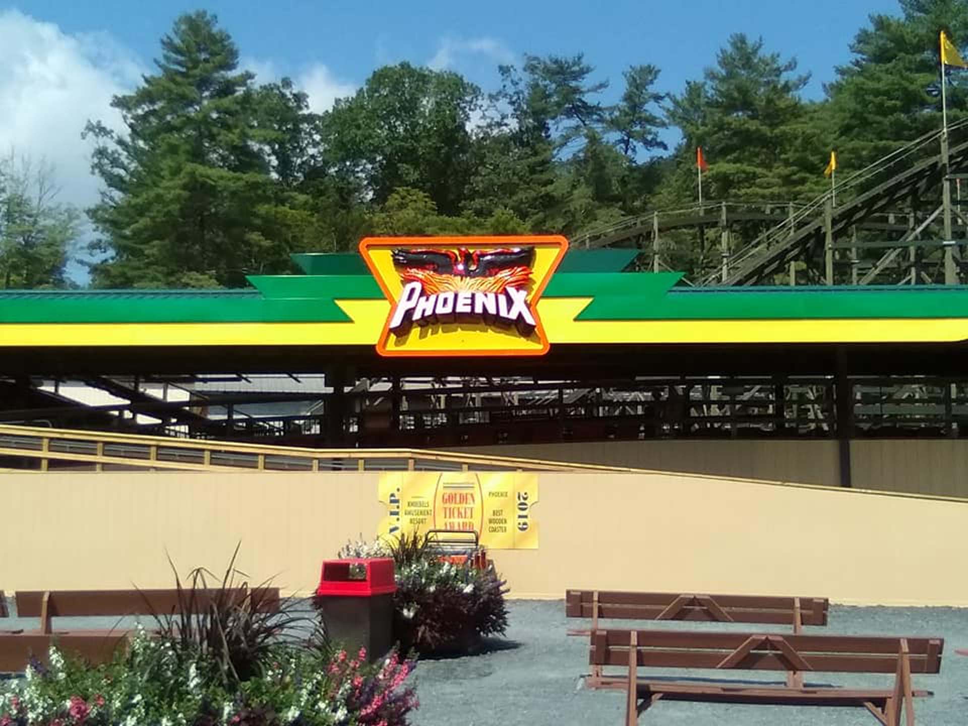 A recent enhancement to Knoebels’ (Elysburg, Pennsylvania) award-winning wood coaster Phoenix is a new look for the station from the front of the ride. In addition to this snazzy aesthetic touch, a layer of queuing was added near the load area to help keep the queue from spilling out into the midway area.