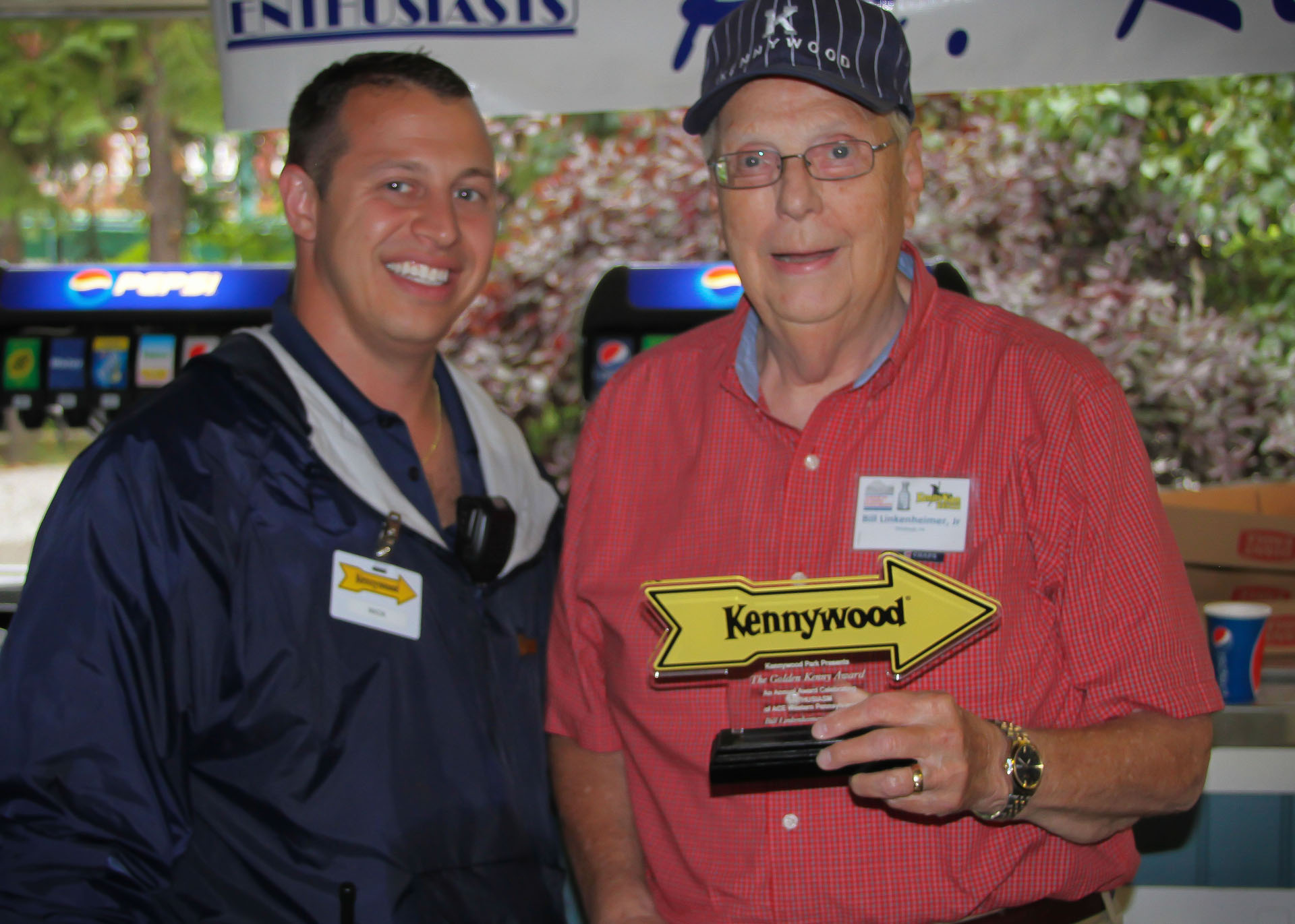 Bill Linkenheimer receives the Golden Kenny Award in 2017, seen here with the park’s PR guru, Nick Paradise.