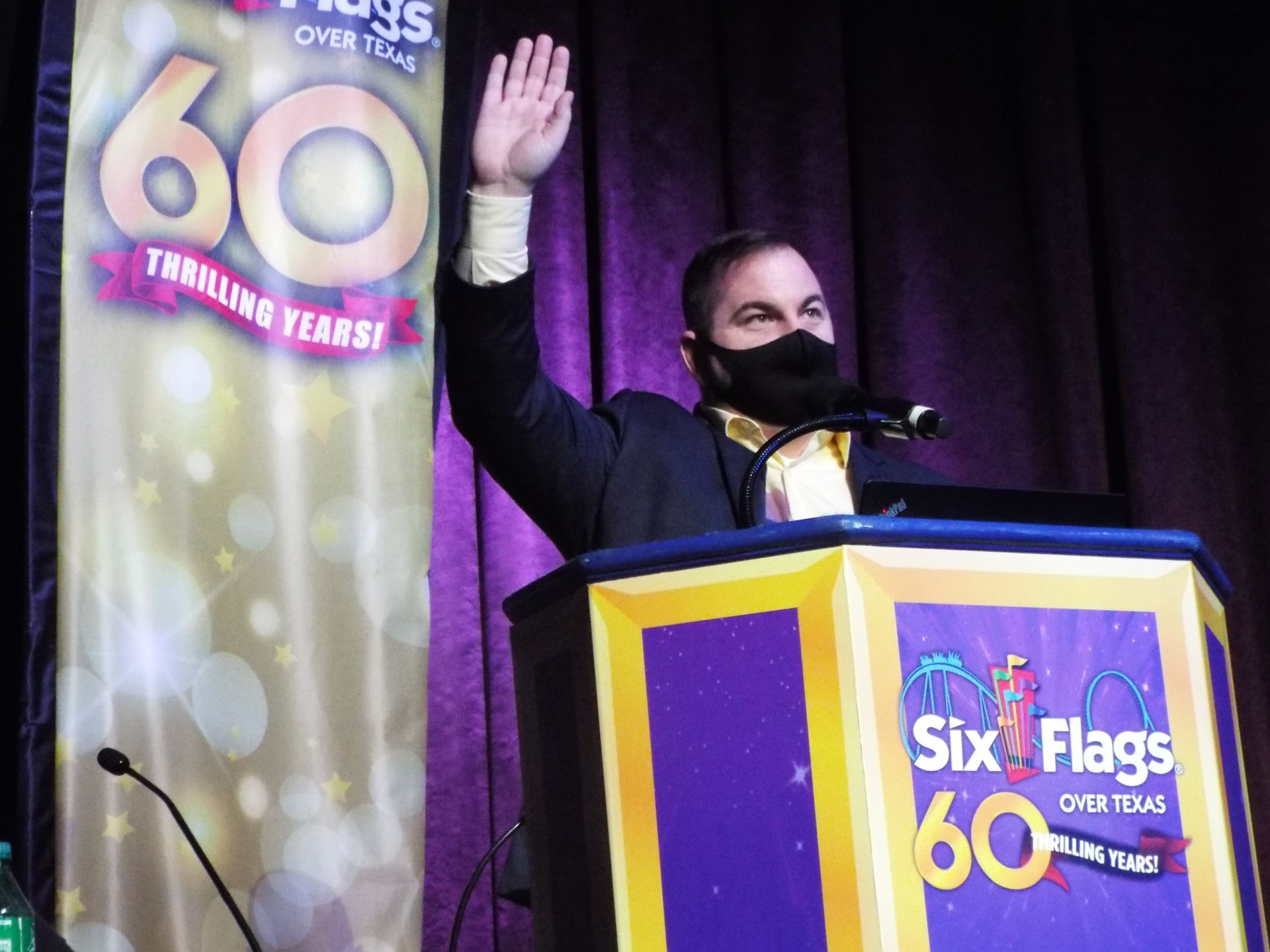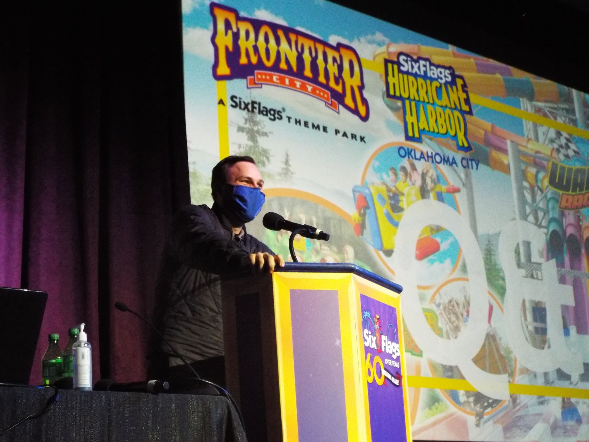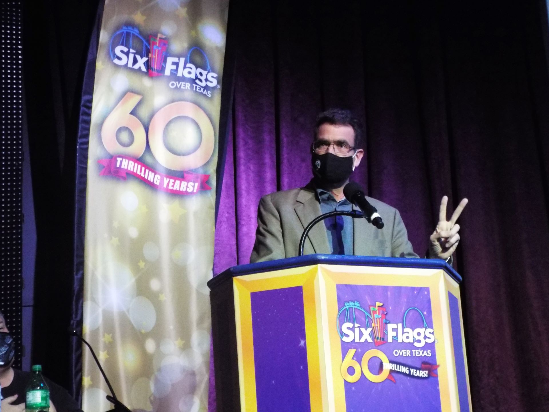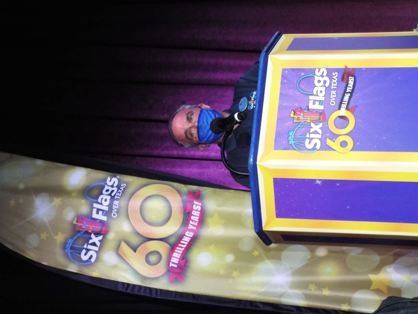 Andrew Miller spoke on behalf of Frontier City — on his last day! — before returning to Six Flags Over Texas.
