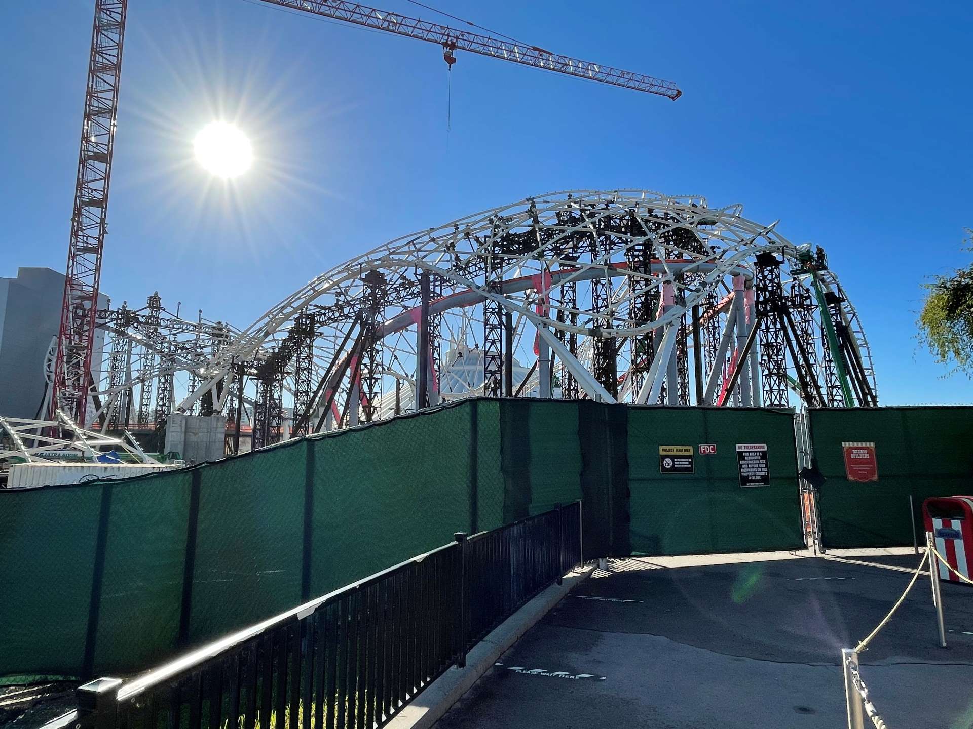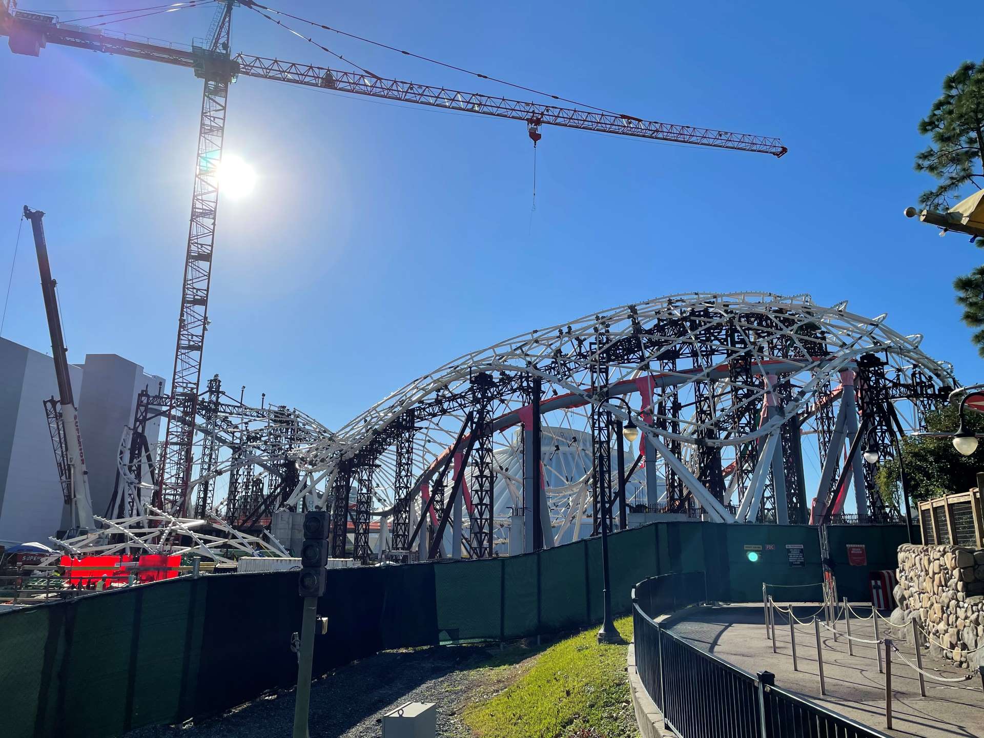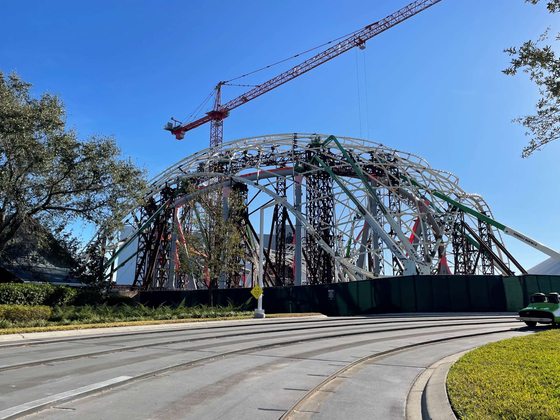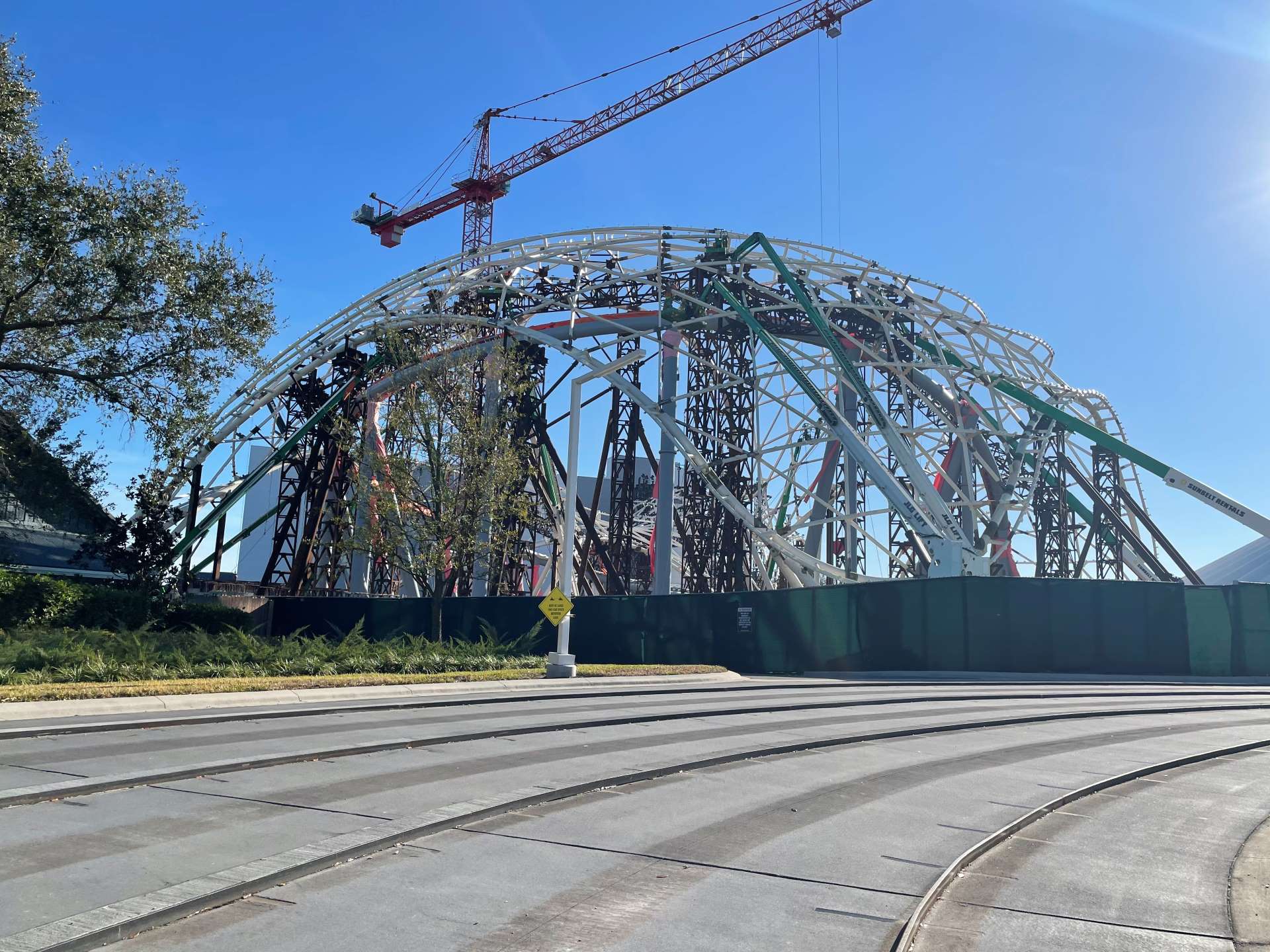 The futuristic canopy covering the white track that stretches from the enclosed ride portion is well under way. This motorcycle-style coaster from Vekoma is eagerly anticipated, in part owing to the cool indoor lighting on the ride. Walt Disney World and Magic Kingdom are celebrating a 50th anniversary this year.