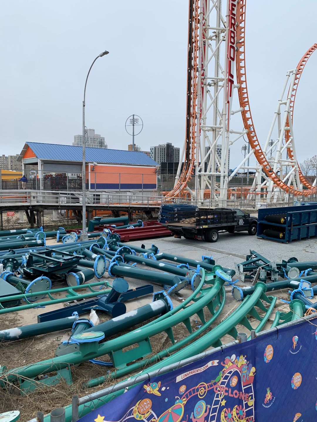 What definitely will be a new credit, is sitting in pieces behind fencing on Stillwell Avenue and on the grass by the ballpark. For those who remember, the plans announced were for a new log flume ride, along with a Zamperla Junior Coaster, an adventure climbing course and a ceremonial entrance. There are footers on the field, and deep green coaster track segments sitting there waiting for construction to resume. It will, but when remains unknown.