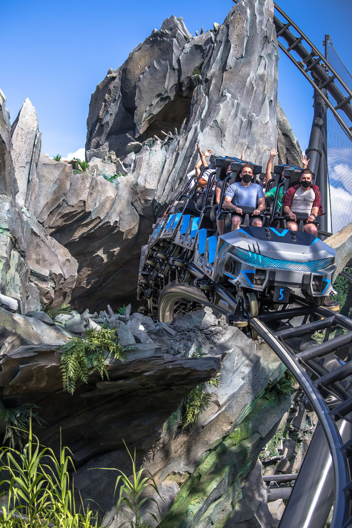 Testing began in September 2020 with a days-long pull-through test, with train cars shrouded in plastic. By November 2020 the train’s design was revealed, and the trains cycled after hours. Obvious daytime testing started by early 2021 with the online enthusiast community buzzing about the spectacular lighting package on the trains and what the ride would be like. The trains seemed to creep around the course, leading to speculation about how intense the forces would feel. Looking more closely at the tight radius of many turns hinted to observers that the trains were rolling fast enough.