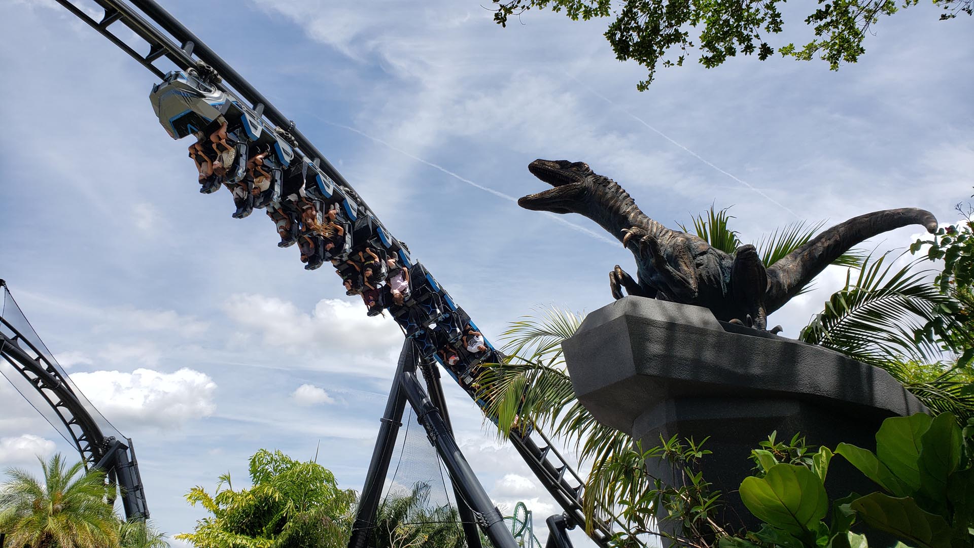 Universal’s Islands of Adventure (IOA, Orlando, Florida) has unleashed Jurassic World’s VelociCoaster! The promotion material’s tagline is, “The hunt is on!” However, thanks to a prolonged testing phase, the Intamin launched thriller has been entertaining local ACE members and park guests weeks before the official June 10 opening date. For some, the “hunt” is finally over! VelociCoaster is running steadily daily in a “technical rehearsal.” Over three years the coaster grew in plain sight but stealthily stormed its way into the hearts and stomachs of all who have ridden it. Local ACE members praise the new coaster. ACE Region Director Chris Kraftchick describes the ride from the first launch to the final brake run as “intense, aggressive and relentless!”