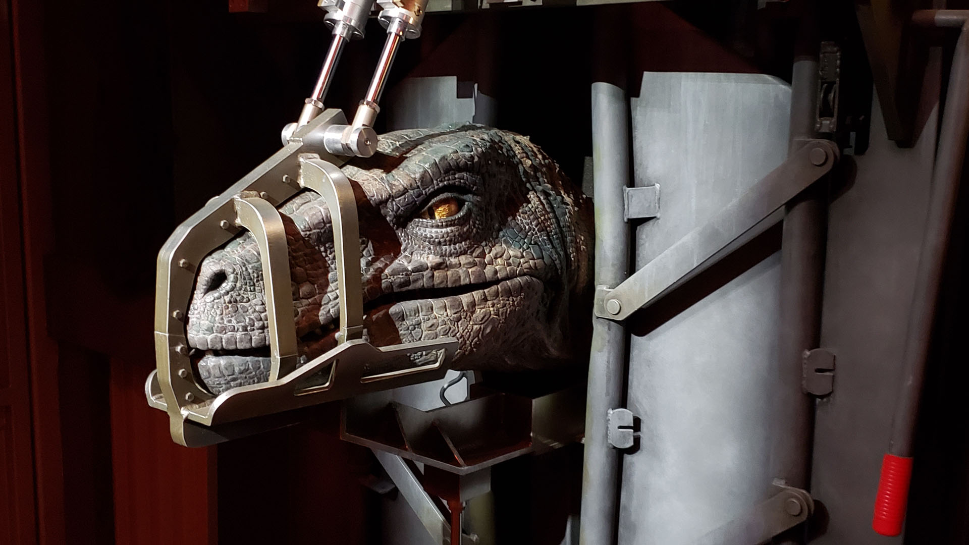 One of the most striking features of the queue is the loading area with a massive observation window against the far wall, where riders exit. It’s the best view of the trains coiling around the first raptor enclosure section or “paddock.” The trains rolling in and out are sleek with aggressive lighting and grillwork on the lead car. Easing into the seats, riders nestle into some of the best restraints available. “The trains themselves are open and comfortable,” assures local ACE member John DeHaas. “Although you only had a lap bar to secure you, it felt safe.” Indeed, the lap bars that swing down from overhead into place are “comfy and pretty accommodating,” according to Hymes. They allow riders to safely feel the extreme forces of the coaster.