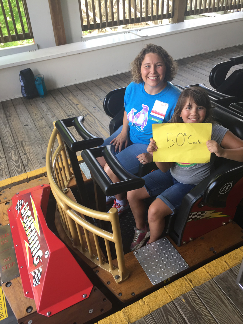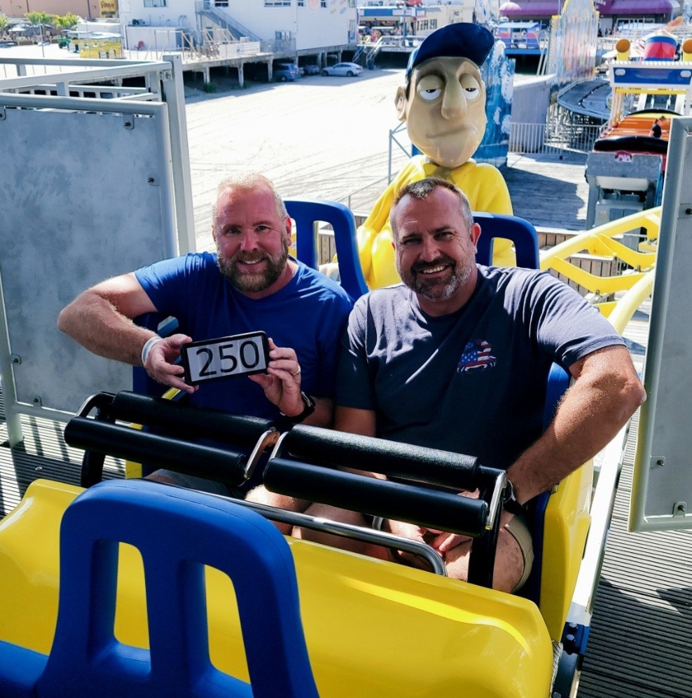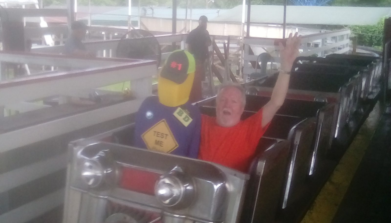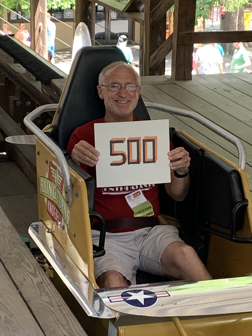 B.D. (Ballast Dummy) and roommate ACE member Rich Wessel enjoy a short ride on Big Dipper at Camden Park in Huntington, West Virginia. This was B.D.’s first ride; Rich has more than 700 and hopes to ride 777 in Las Vegas.
