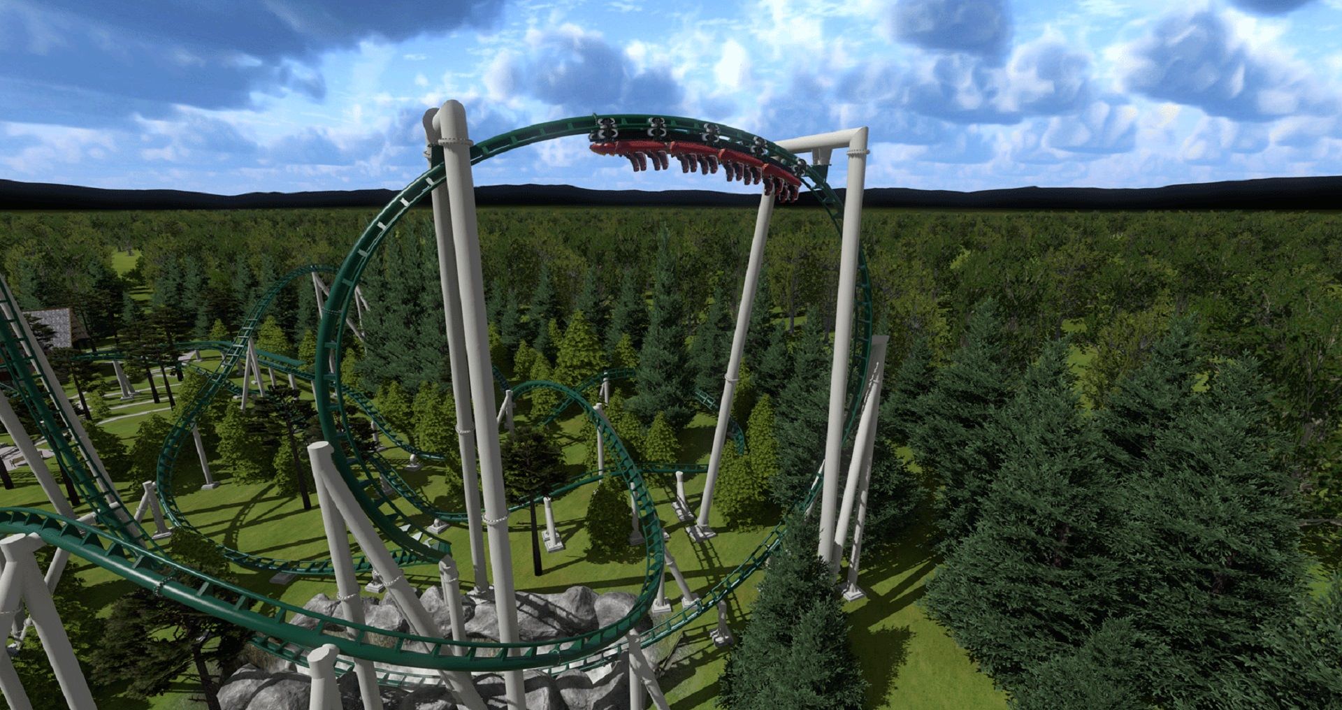 Start with the three inversions. The first is described as a “world’s first.” Dubbed a “stall loop” by the park, it looks designed to momentarily hang riders in an inverted state. Is this actually new? That remains to be seen. However, whether it is or isn’t doesn’t really matter. It looks to be great fun. Plus the exit of the loop has a dramatic directional change. The other two inversions are in the vein of barrel rolls and corkscrews, but notably, the third inversion flips through a building. Nice. It will deliver great spectator appeal to those waiting in the station.
