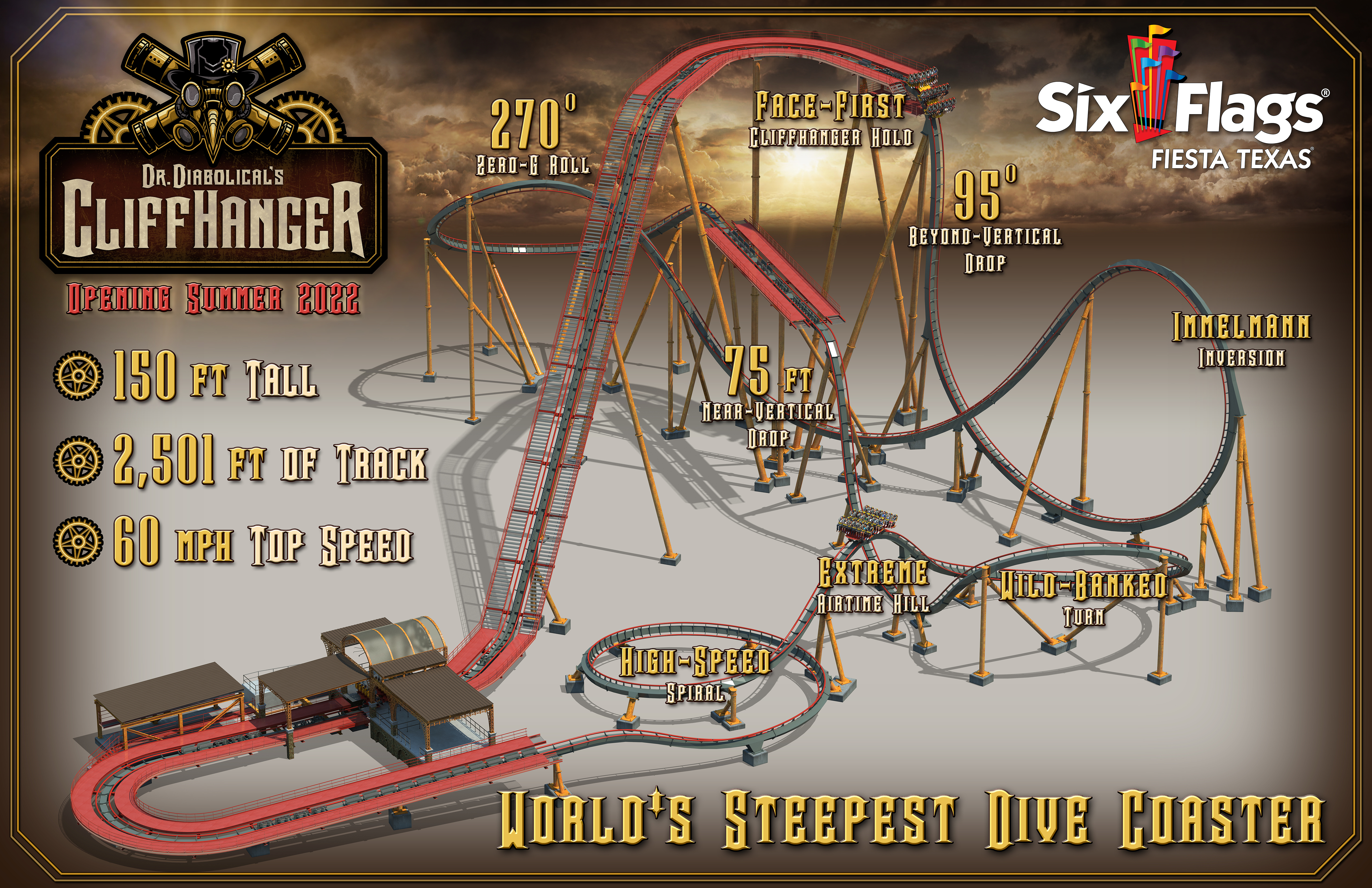At 150 feet tall, the coaster will have the world’s steepest drop for a dive coaster, 95 degrees, a second, near-vertical 75-foot drop. Track length of 2,501 feet will include elements such as a 270-degree zero G-roll, a high-speed spiral and some serious airtime. Dr. Diabolical’s Cliffhanger will reach speeds up to 60 mph.