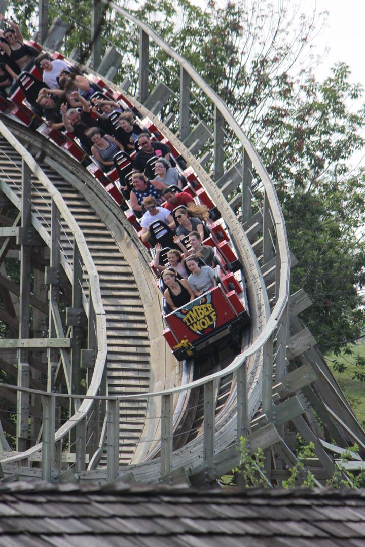 The hot and humid day began well before the park opened with cooling towels for everyone given by Worlds of Fun. Once everyone had a towel, attendees were off to Timber Wolf for an exclusive behind-the-scenes tour that took the group into off-limits areas like the carpentry shed, underneath the station and into the ride itself. After chatting with Timber Wolf’s maintenance staff, it was off for more world-spanning adventure with a walk around the park and lots of history.