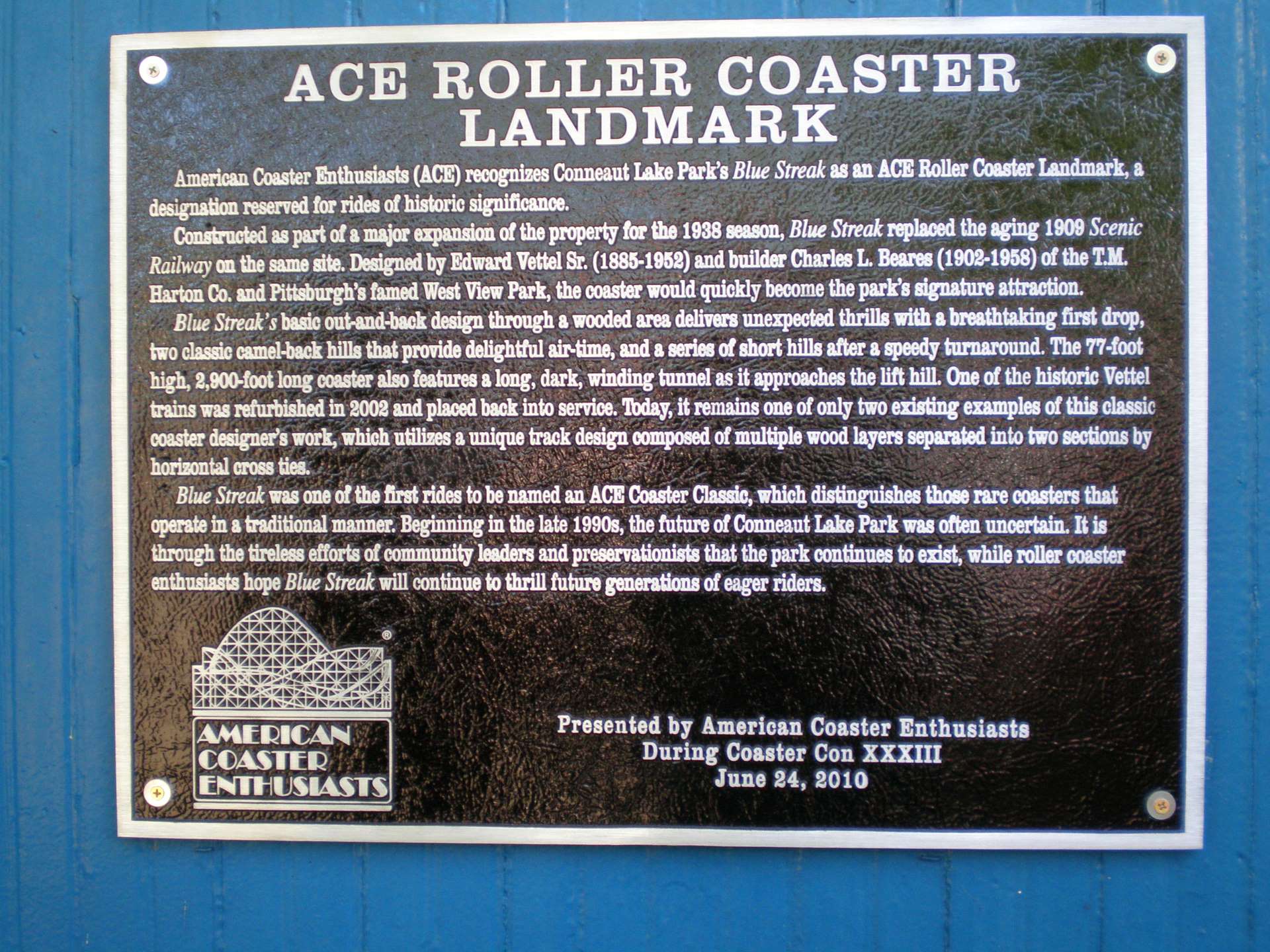 Blue Streak is an ACE Roller Coaster Landmark, a designation reserved for rides of historic significance. While there are well over 4,000 roller coasters in the world, only 45 have been designated as an ACE Roller Coaster Landmark. It is among the 20 oldest existing roller coasters in North America and only one of two remaining designed by world-renowned designer Edward Vettel Sr. Additionally, Blue Streak is just one of 30 roller coasters in the world that qualify as an ACE Coaster Classic, an award reserved for rides that provide a truly pure, traditional roller coaster experience.