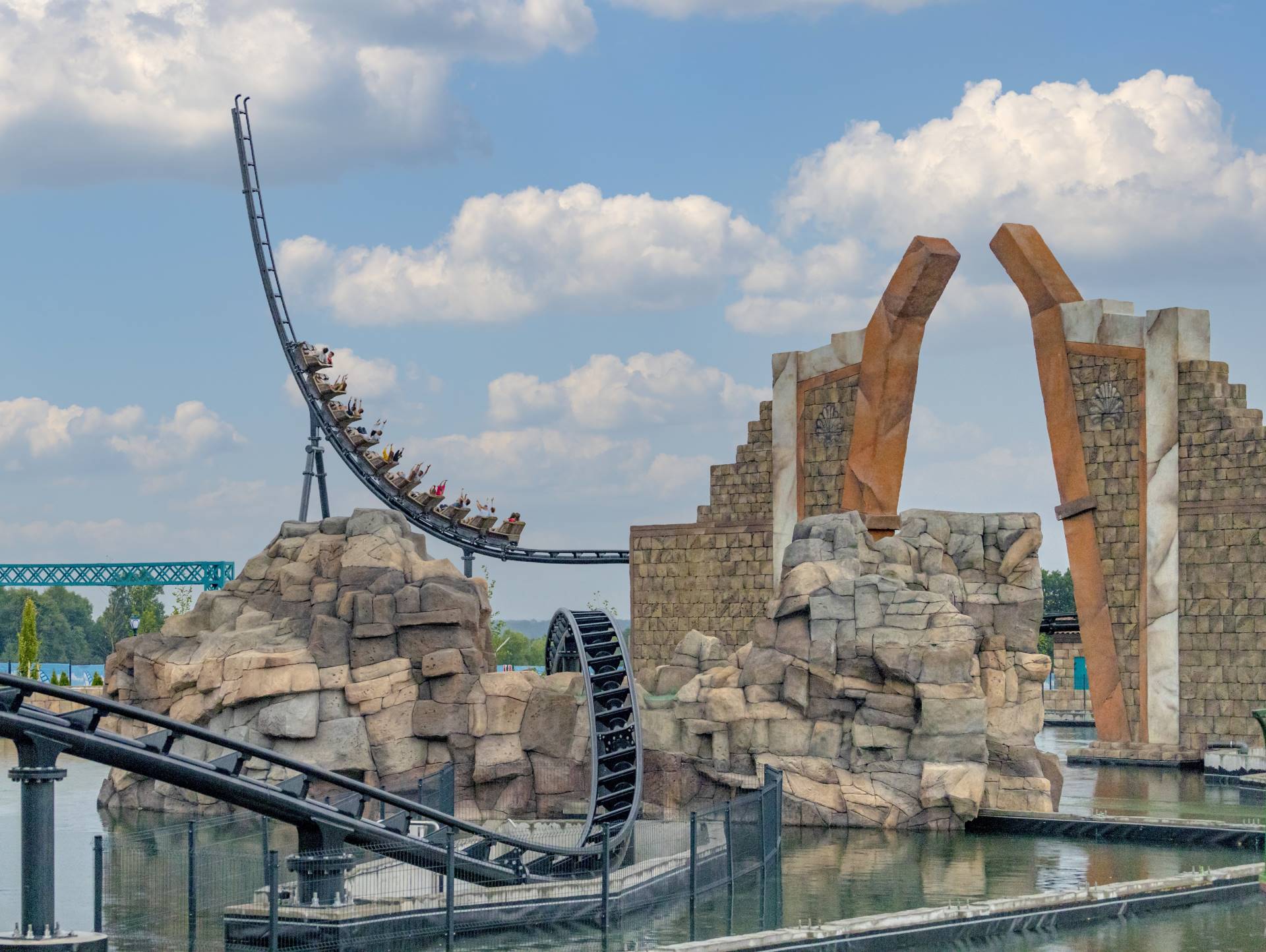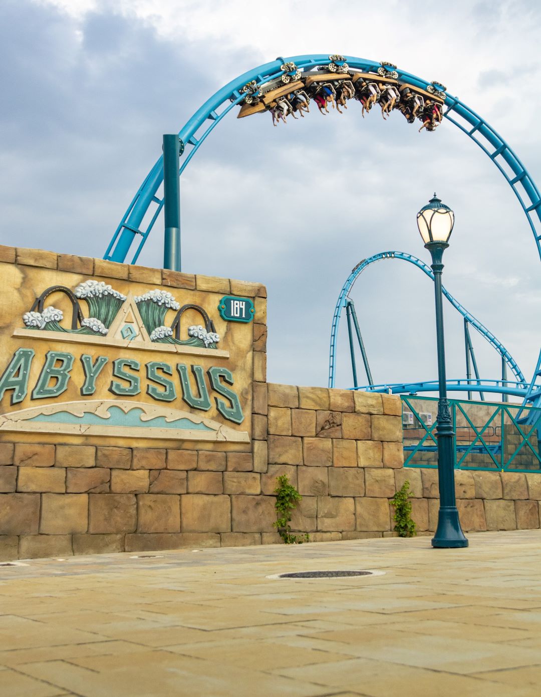 Once dispatched from the station, trains receive the first of two launches. Unlike most coasters in which the first half is the most intense, Abyssus reverses that. The first act is filled with thrilling curves, directional changes and airtime hills, but following the second launch — which zips the trains up to 62 mph — the highest point is reached (126 feet) and is followed by a dramatic dive into a vertical loop. Amid countless banked turns, a batwing inverts riders twice along with a very stretched-out corkscrew. It’s the constant directional changes that make the 4,318-foot coaster feel incredibly compact and make it feel as if it goes on forever.
