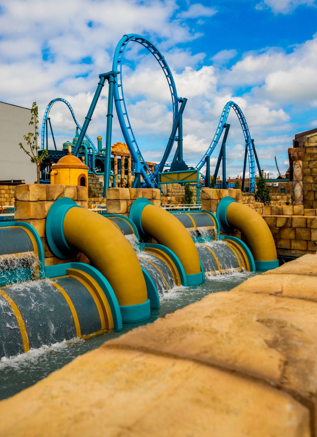 The fluid inversions alone are smoothly navigated, making for scream-inducing thrills, but it’s the integration of darting through and under themed structures and diving into trenches that makes the coaster a signature piece. Fans of Montu (Busch Gardens Tampa Bay, Florida) will relish the use of the below-ground maneuvers.