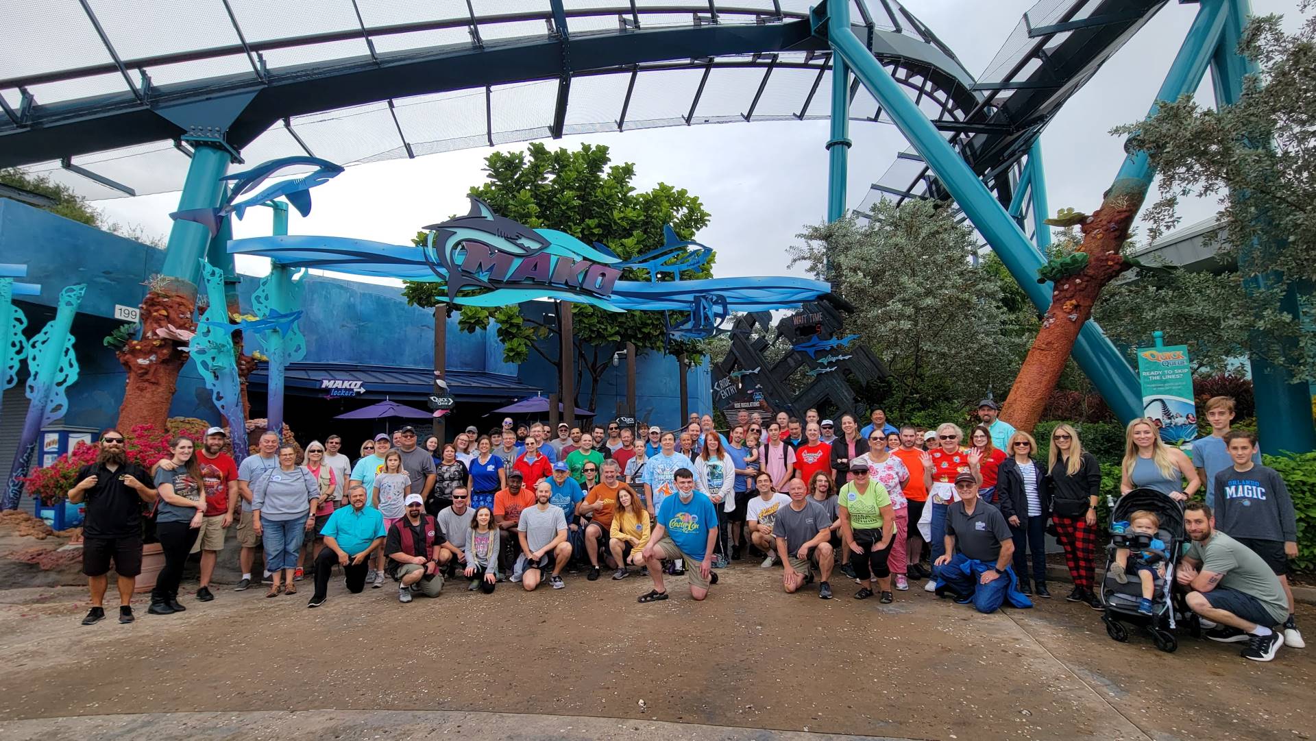 After a successful IAAPA Expo, 89 ACE members and guests enjoyed a full day of holiday celebrations at SeaWorld Orlando. On Saturday, November 20, SeaWorld Orlando opened the park early to ACE members for an hour-long ERT session on Mako, Florida’s only hypercoaster, manufactured by Bolliger & Mabillard (B&M). The inspiration for the coaster is the mako shark, so walking through the queue, riders learn about how sharks hunt for their food. In the station, they board the stylish seven-car coaster train and travel up a 200-foot high lift hill. Mako’s first drop offers a thrilling experience in any row, and riders then experience the most floating airtime offered on any other coaster in Florida!