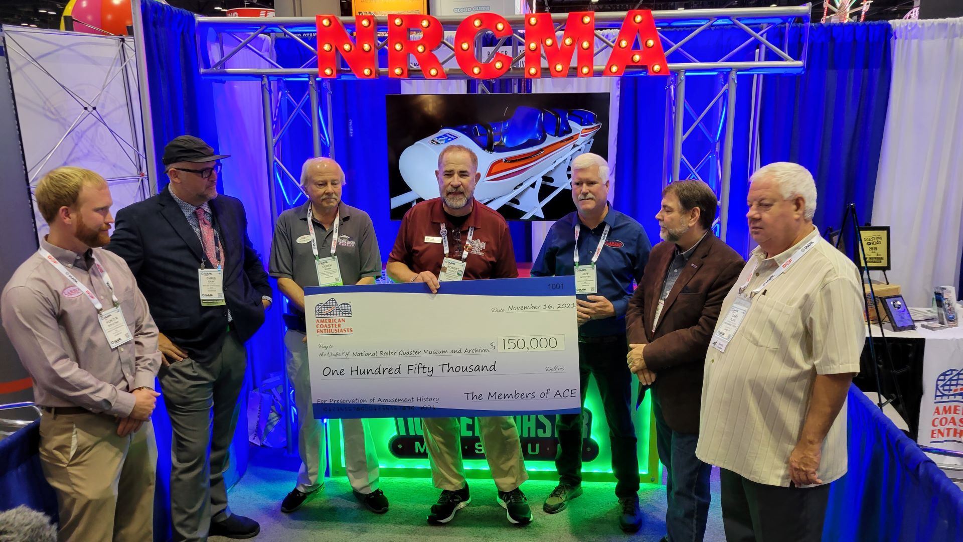 On Thursday afternoon, ACE officially presented the National Roller Coaster Museum and Archives (NRCMA) with the second check in its three-part donation totaling $150,000. Many of the NRCMA board members were present for the presentation by Robert Ulrich, president of ACE.