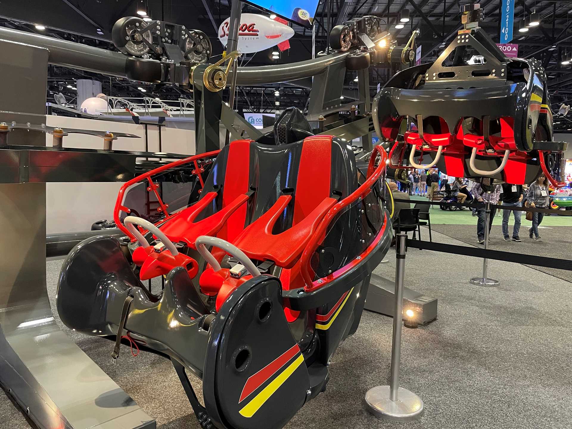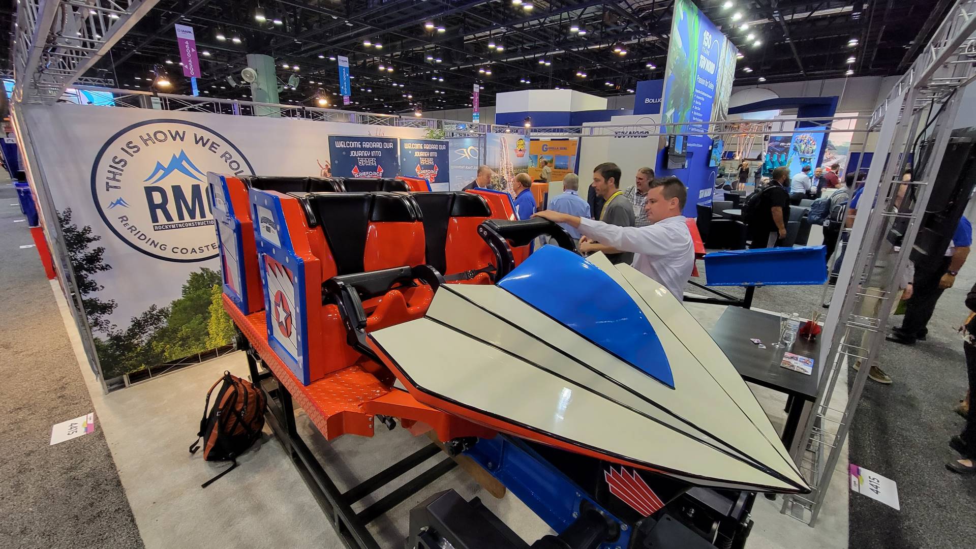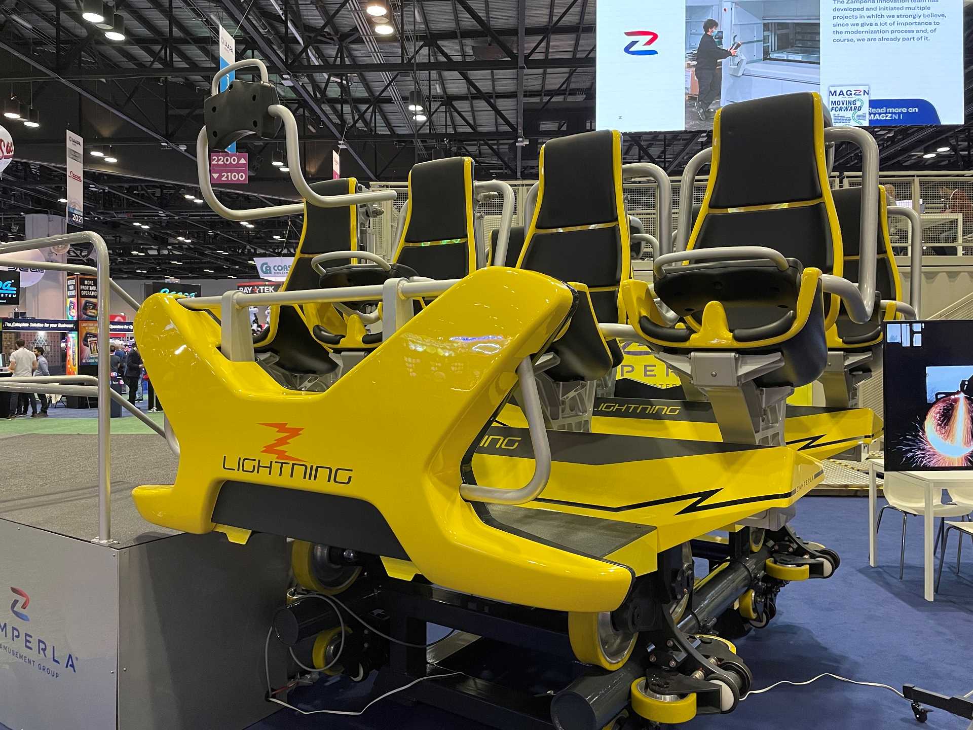 The Lightning train vehicle at the Zamperla booth was available for people to check out its comfortable seating.