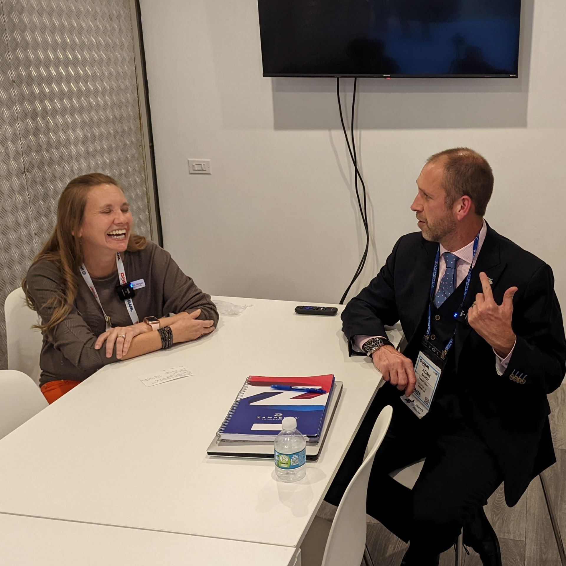 ACE Communications Director Elizabeth Ringas chats with Adam Sandy from Zamperla.